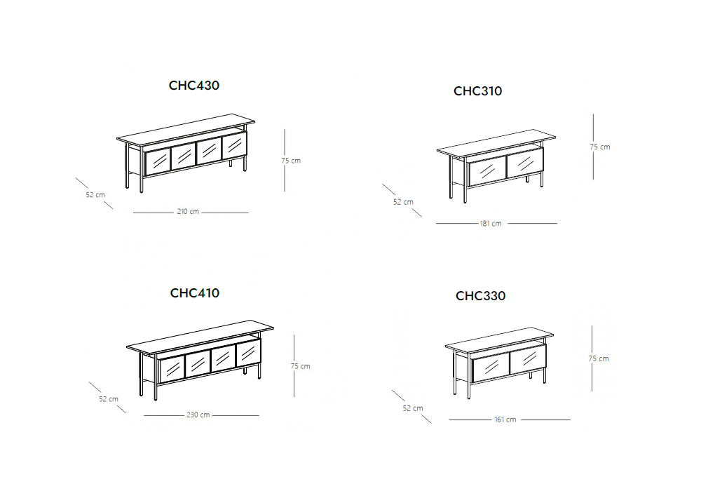 | Dimensions | 161 x 52 x H 75 cm, 161 x 52 x H 59 cm; 181 x 52 x H 75 cm; 181 x 52 x H 59 cm; 210 x 52 x H 75 cm; 210 x 52 x H 59 cm; 230 x 52 x H 75 cm; 230 x 52 x H 59 cm. |