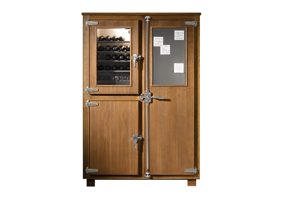 Dispensa Fredda conçue par L'Ottocento est une unité de conteneur avec cave à vin et réfrigérateur, elle peut être réalisée en chêne ou en cerisier pour s'adapter aux différents modèles de cuisine.