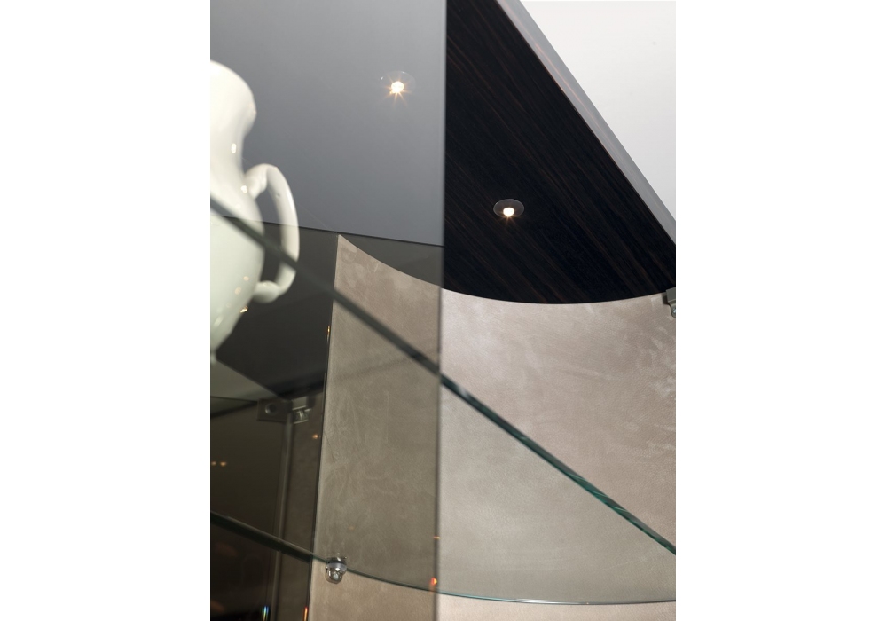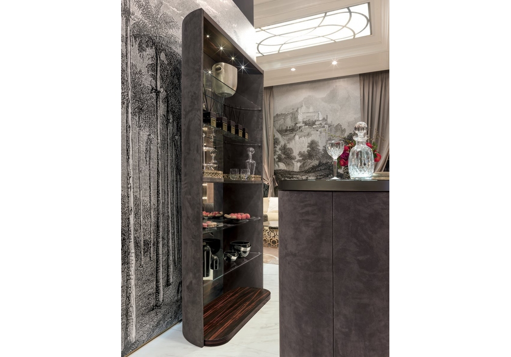 Hennesy conçue par Giuseppe Iasparra pour Longhi est une vitrine avec ou sans portes vitrées. Structure galbée recouverte de cuir et partie centrale en miroir. Étagères façonnées en verre transparent avec parties métalliques avec motif Sequence. Surface supérieure et inférieure en ébène opaque ; l'étage supérieur est éclairé par spots led.