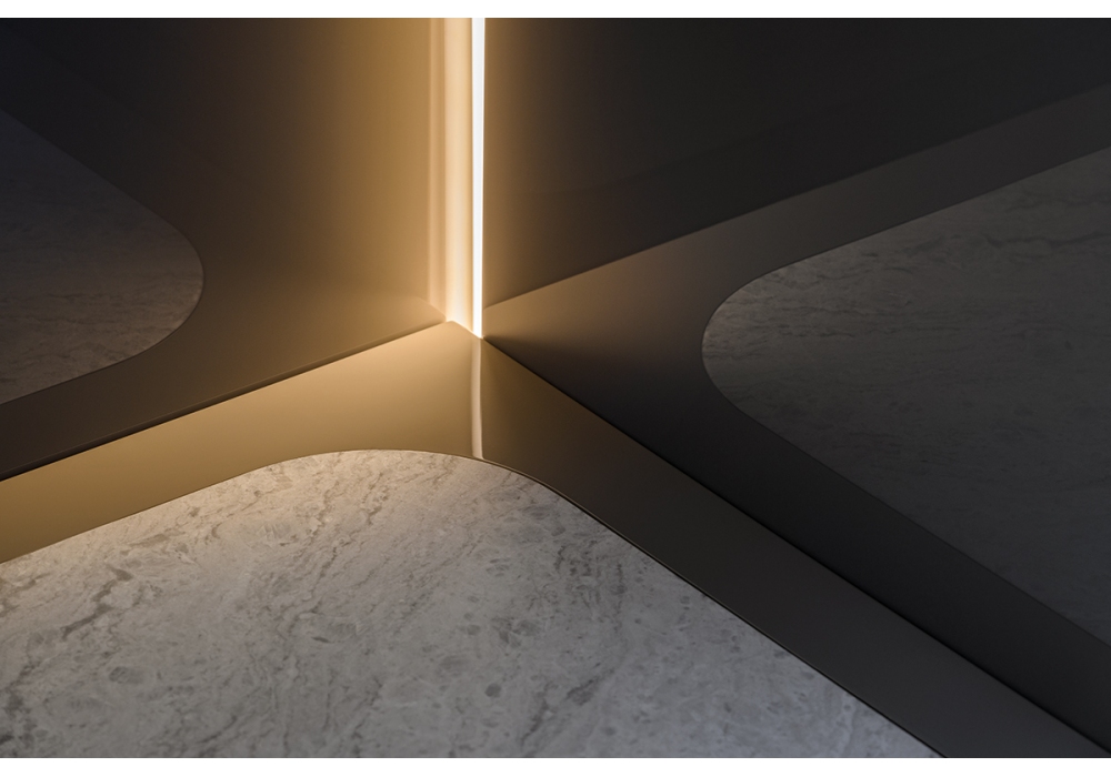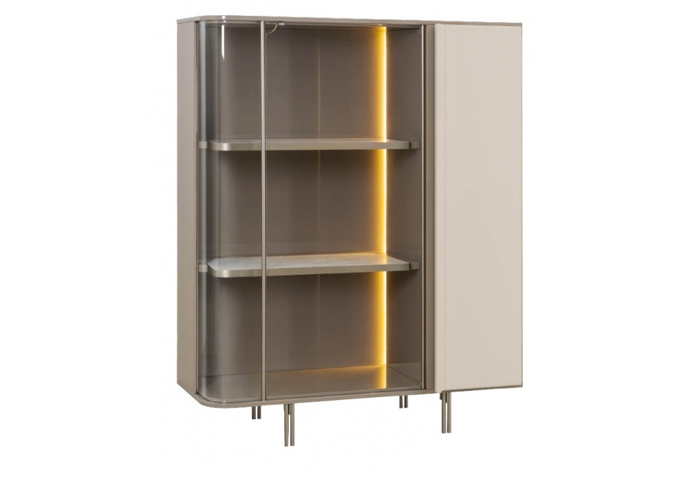 Zero conçue par Andrea Bonini pour Turri est une vitrine avec structure en MDF et panneaux de particules en finition polyester laqué brillant, avec une porte vitrée et une recouverte de cuir. Pieds et détails en métal mat. À l'intérieur, il y a un compartiment latéral équipé de trois étagères en verre, une principale équipée d'un éclairage LED et deux étagères de différentes finitions.