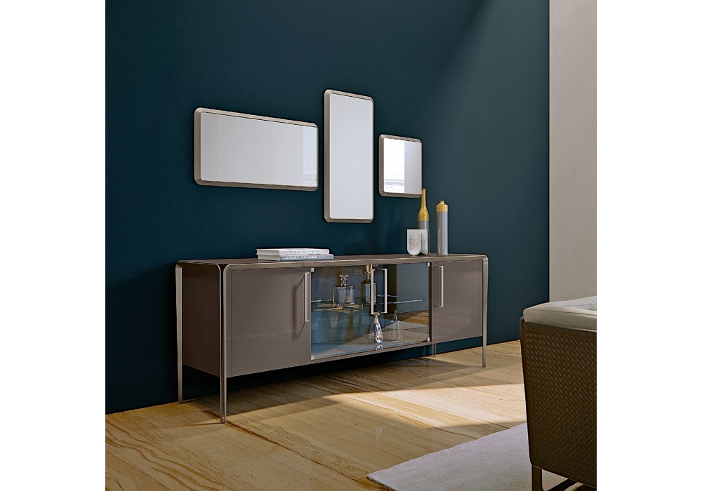 Milano conçu par Blengini Ghirardelli pour Turri est un buffet avec structure en MDF laqué brillant avec pieds en métal courbé avec inserts en cuir. Il a deux compartiments avec une étagère en bois et un compartiment avec une étagère en verre. Il y a deux portes vitrées et deux laquées brillantes.