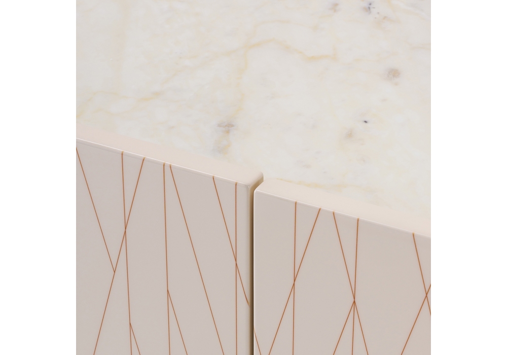 Roma conçu par Monica Armani pour Turri est un buffet avec structure en MDF et contreplaqué laqué brillant avec structure latérale revêtue en cuir. Le plateau peut être réalisé en cuir ou en marbre et les pieds sont en métal en deux finitions. Disponible dans la version avec portes avec ou sans décoration. Sur demande portes vitrées.