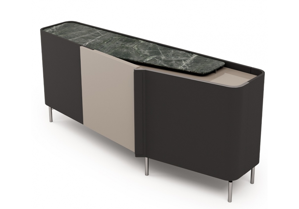 Zenit conçu par Andrea Bonini pour Turri est un buffet avec structure en MDF et contreplaqué en finition polyester laqué brillant et revêtement en cuir. Il y a deux compartiments internes équipés chacun d'une étagère en verre. Portes en bois incurvées avec applications en cuir et porte centrale en bois avec finition laquée brillante. Dessus en marbre et dessous laqué brillant.