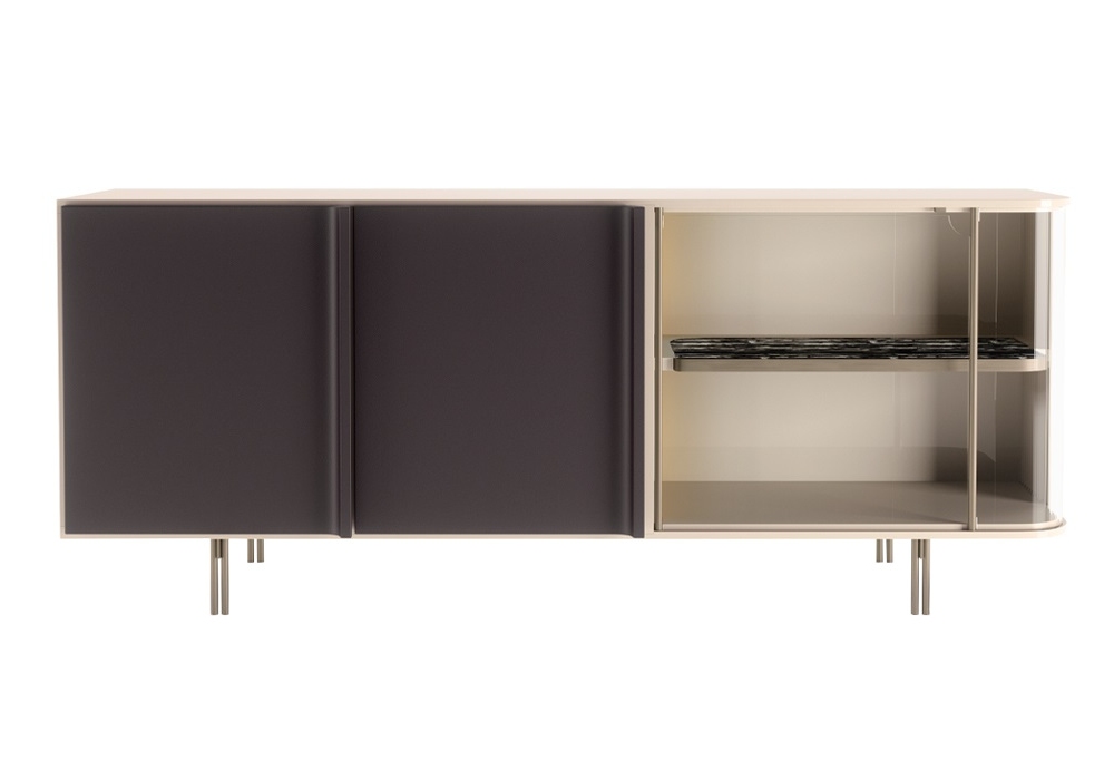 Zero conçu par Andrea Bonini pour Turri est un buffet avec structure en MDF et panneaux de particules laqués brillants. Il y a deux portes en bois recouvertes de cuir et une en verre, deux compartiments équipés chacun d'une étagère en verre, un compartiment latéral avec porte en verre, équipé d'un éclairage LED et une étagère en bois laqué ou en marbre. Jambes et détails en finition mate.