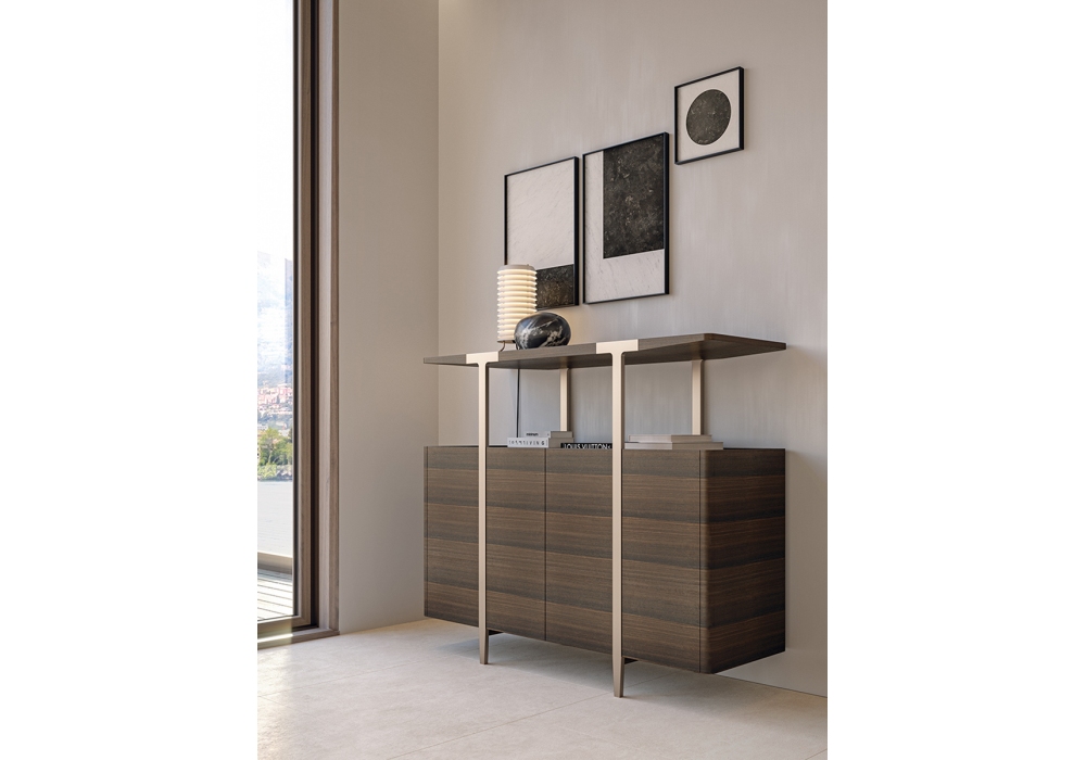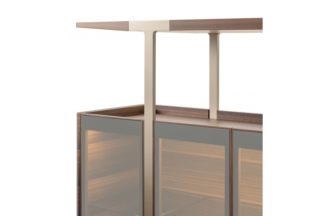 Domus conçu par Matteo Nunziati pour Turri est un meuble de rangement avec structure en MDF et panneaux de particules avec placage d'eucalyptus traité thermiquement. Portes en verre réfléchissant ou en bois plaqué Eucalyptus traité thermiquement. À l'intérieur, il y a trois compartiments avec des étagères en verre. Pieds en métal finition platine mat. Sur demande, il est possible d'ajouter un éclairage LED interne.