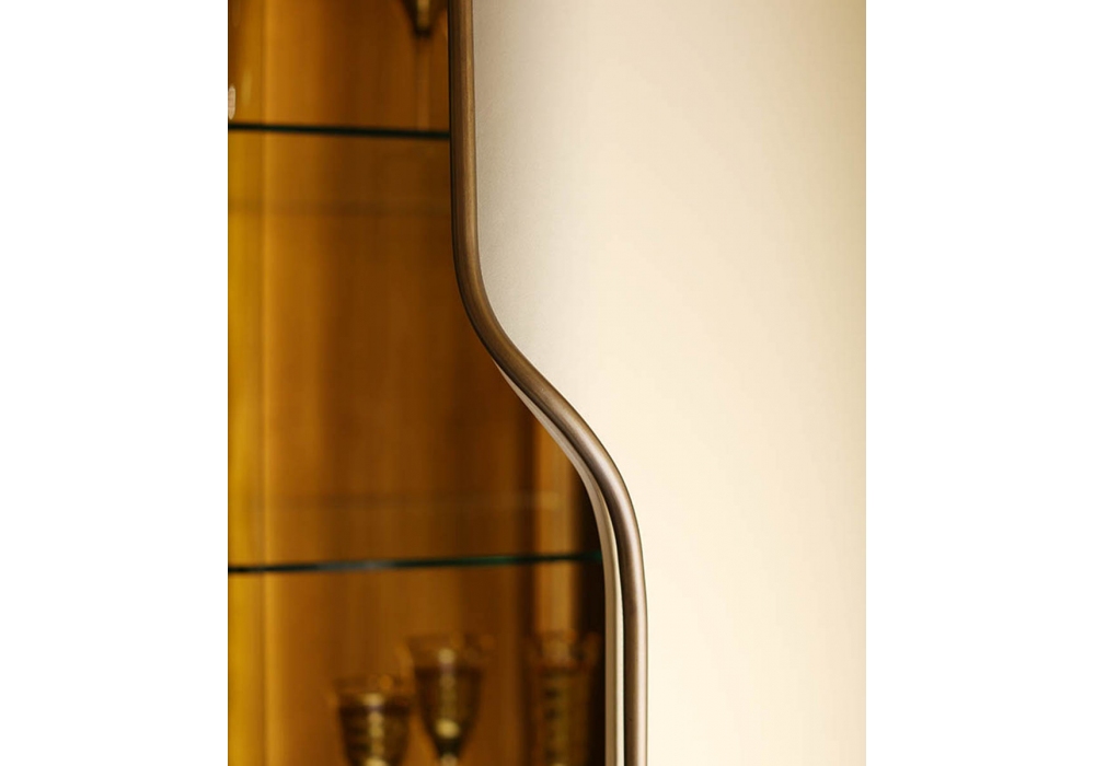 Melting Light Cuir conçue par Frank Jiang pour Turri est une vitrine avec structure en MDF, contreplaqué, bois massif et panneaux de particules plaqués noyer. Une porte est en verre bronzé et l'autre est recouverte de différents cuirs. À l'intérieur, il y a deux compartiments avec trois étagères en verre chacun. Éclairage LED.