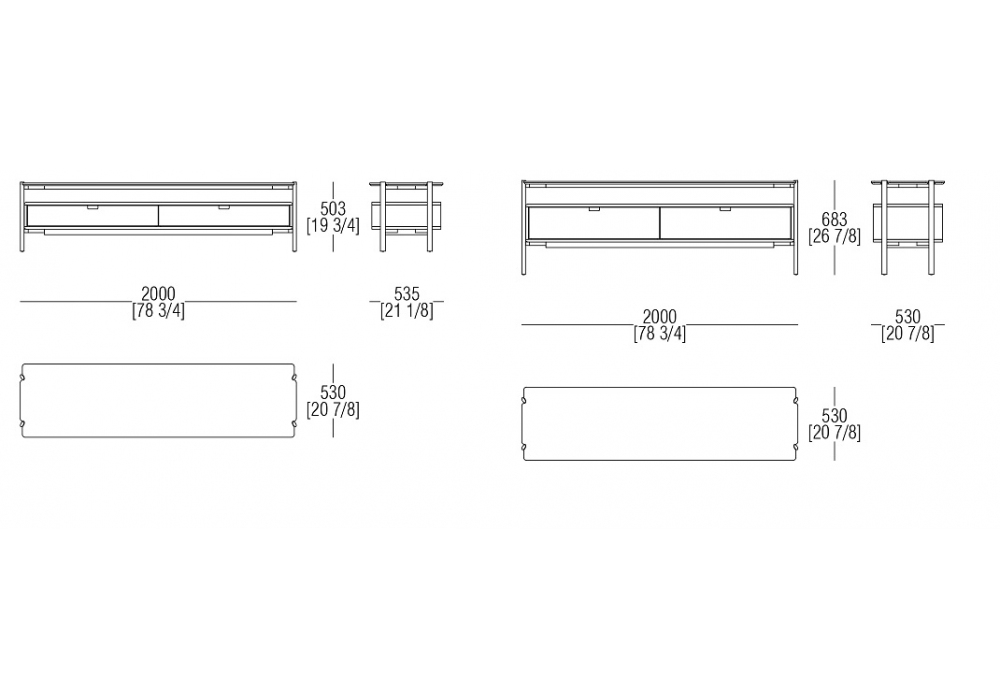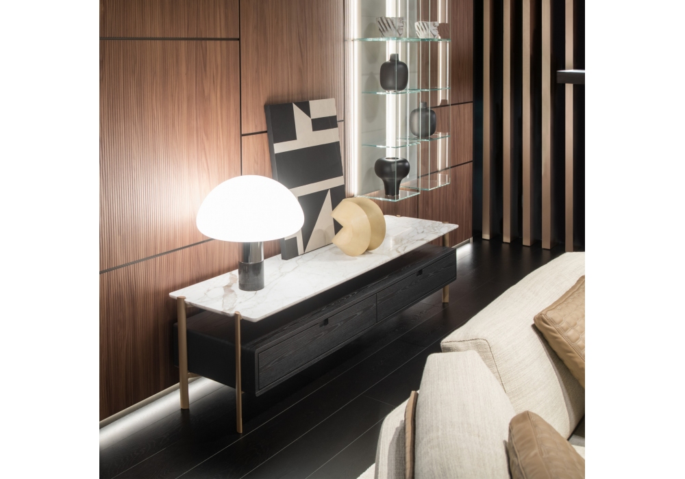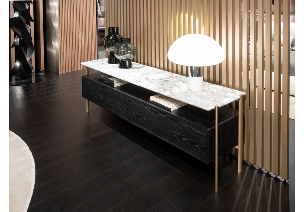 Eros conçu par Studio 63 pour MisuraEmme est un buffet caractérisé par une structure en métal bronze supportant le conteneur en chêne noir et le plateau en marbre. Disponible en deux dimensions.