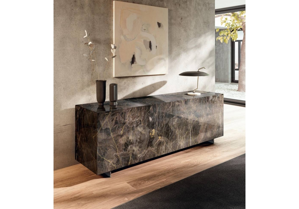 Plenum conçu par Franco Lago est un buffet entièrement recouvert de verre. Les portes ont une ouverture coulissante coplanaire. Il est disponible en deux tailles et en différentes finitions.