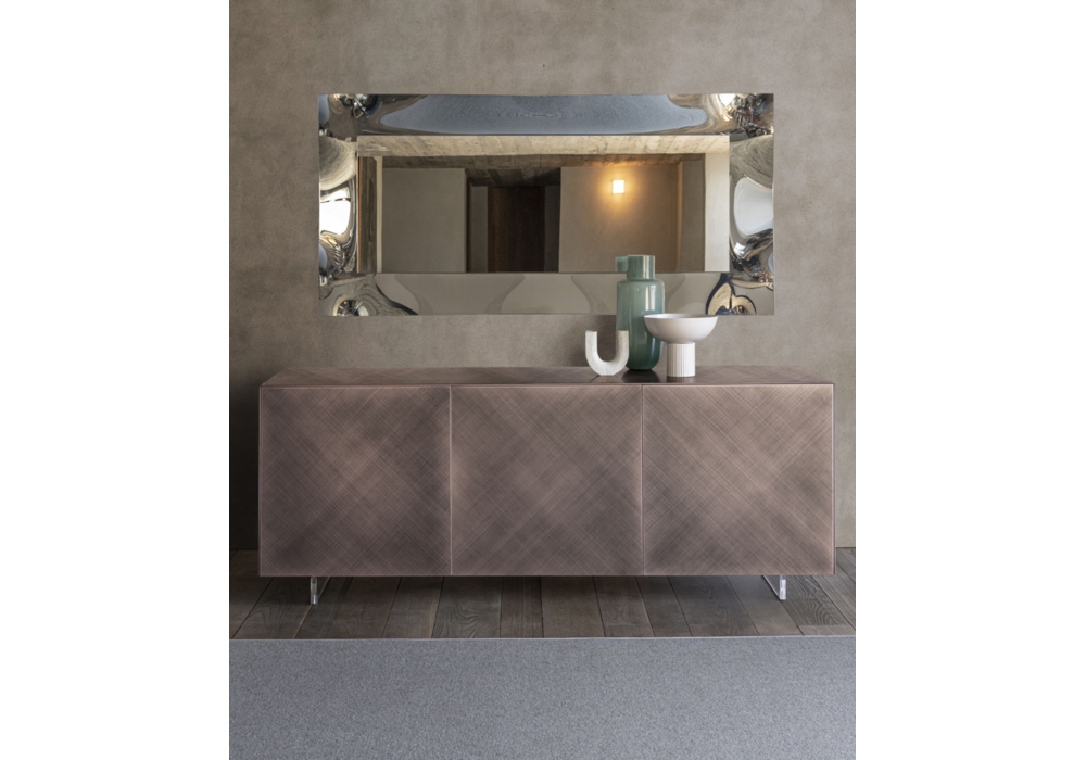 Essential signé by reflections est un buffet en bois laqué en finition Tiben brossée à la main avec un effet rayé et croisé. À l'intérieur, il y a des étagères en cristal transparent. Les ouvertures sont push-pull. Sur demande, il est possible d'insérer des tiroirs internes.