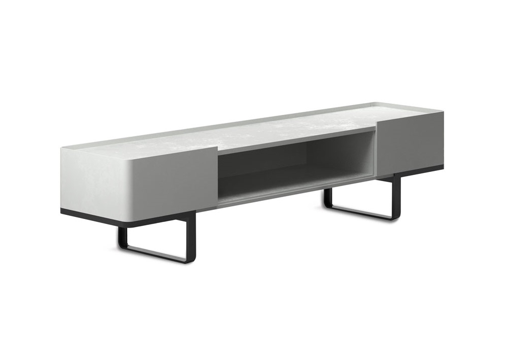 Mayor Low conçu par Marco Piva pour Casamania & Horm est un buffet soutenu par deux pieds métalliques symétriques, unis à la pièce dans la partie inférieure uniquement latéralement. Le plateau central est légèrement en retrait et présente un bord latéral sans arêtes vives qui adoucit l'ensemble de la structure.