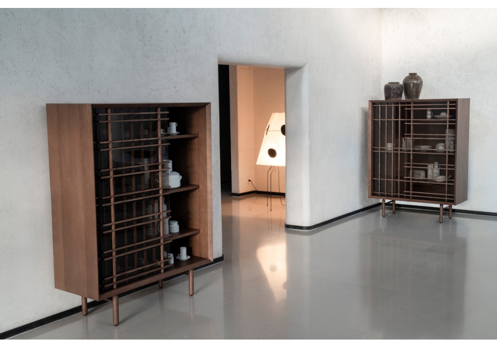 Sen conçue par Chiara Andreatti pour Potocco est une meuble de rangement avec structure en frêne massif. Portes coulissantes en verre float trempé bronze ou transparent.