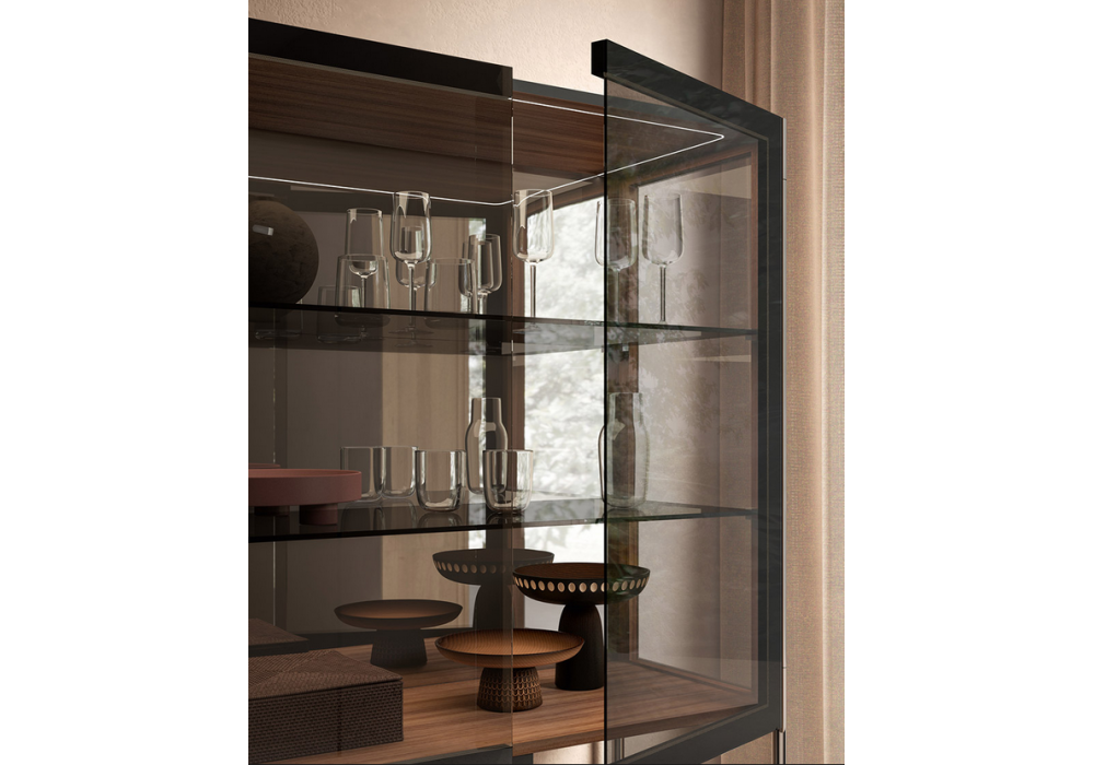 Spin signé par Alessio Bassan & Silvano Pierdonà pour Capodaopera est une vitrine avec des hanches et des portes en verre gris avec un effet décoratif noir ombré collé sur un cadre périmétrique. Le plan peut être choisi entre différentes finitions. Il y a deux portes, un compartiment interne et deux étagères mobiles en verre gris. Sur demande, des étagères supplémentaires sont ajoutées.