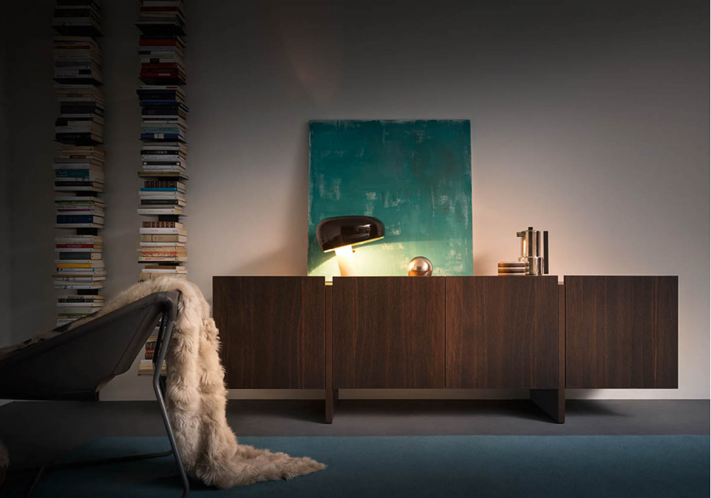 Recta conçu par Marelli & Molteni pour Alf Dafrè est un buffet avec structure en chêne ou laqué avec finition interne en mélaminé cuir crème.