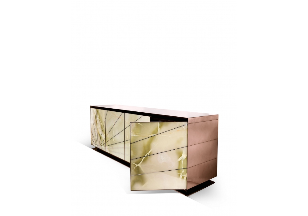 Aurora conçu par Steve Leung pour Visionnaire est un buffet quadrangulaire avec une structure en bois avec base et coque recouvertes d'une fine tôle d'acier inoxydable. Aurora est disponible en différentes finitions.