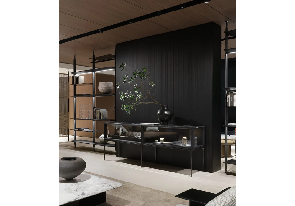 Aiko conçu par Jean Marie Massaud pour Poliform est un buffet avec double porte à rabat (MAK6 - Salone del Mobile 2024). Structure en orme noir. Dossier/s en orme noir ou verre transparent extralight. Côtés latéraux et façades en orme noir ou verre transparent extralight. Poignées en nickel brun mat, intégrées dans le profil supérieur de la porte. Plateau en orme noir ou en marbre mat et brillant. Base avec pieds en métal peint nickel brun mat.
