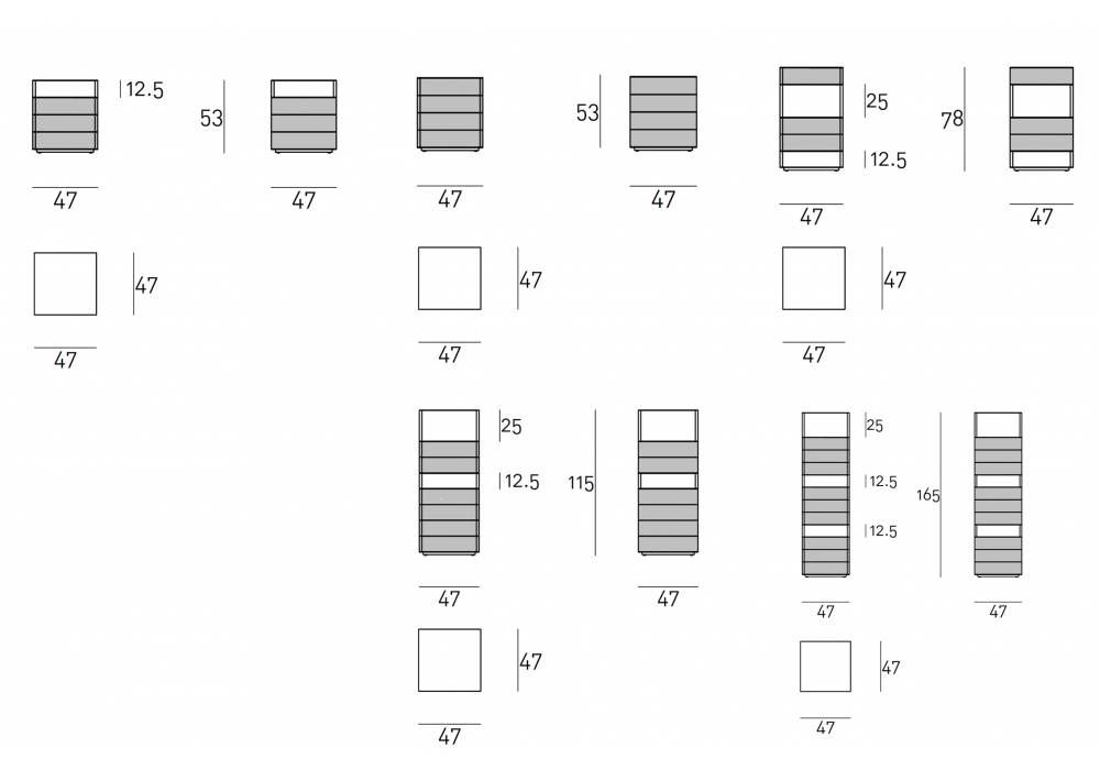 | Dimensions | 47 x 47 x H 53 cm; 47 x 47 x H 53 cm; 47 x 47 x H 78 cm; 47 x 47 x H 115 cm; 47 x 47 x H 165 cm. |