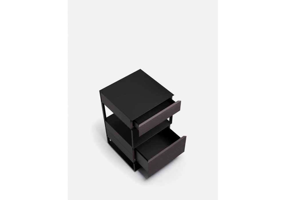 Halfsquare conçue par Giacomo Moor pour Living Divani est une table de chevet quadrangulaire avec une structure porteuse en métal thermolaqué et une base de support en MDF noir. Les tiroirs sont en MDF plaqué noyer Canaletto ou gris rayé avec côtés en métal noir carbone mat, tandis que le fond et le dos sont en MDF laqué noir mat. Les pieds d'appui sont réglables en PVC noir. Halfsquare est disponible en différentes finitions et modèles.