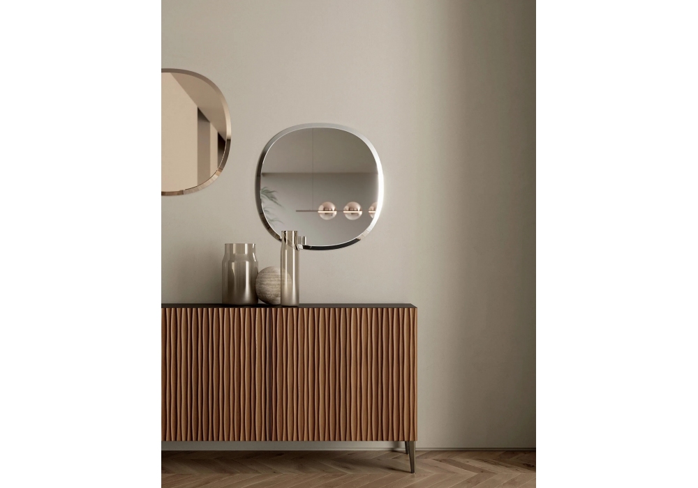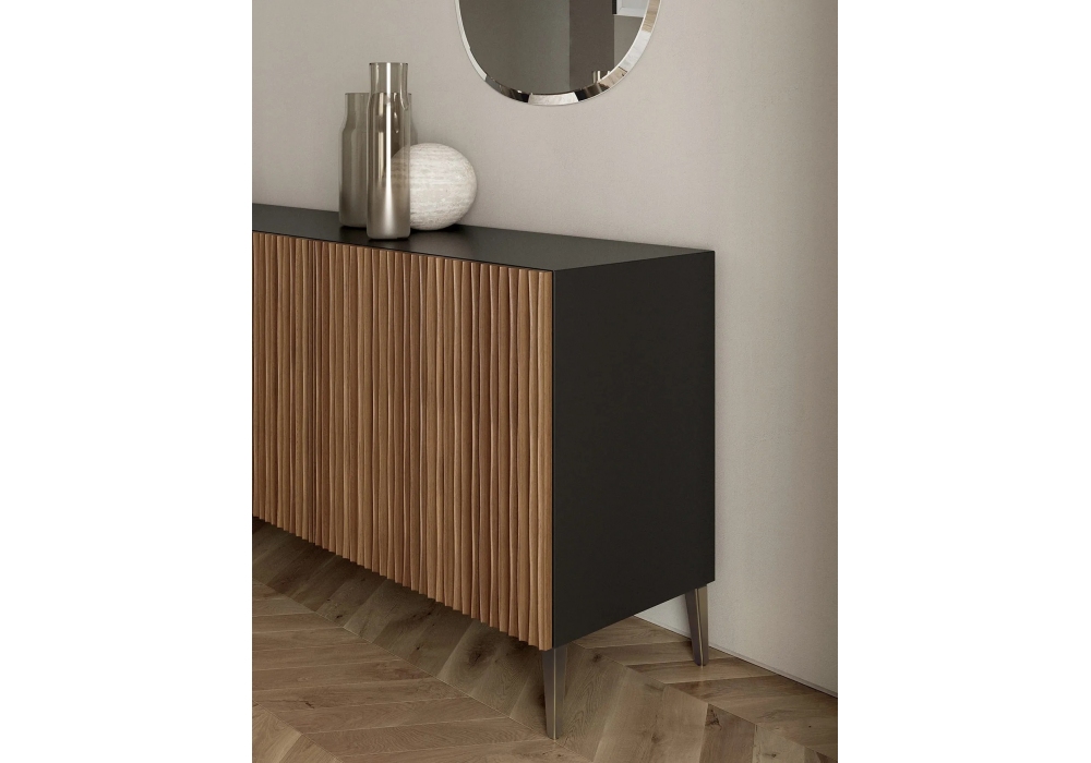 15.48/15.49 Musa conçu par E-Ggs pour Bontempi est un buffet avec une structure en bois, composé de deux ou trois portes battantes, étagères internes en verre transparent, côtés en bois laqué et pieds en aluminium laqué. Disponible en différentes finitions et tailles.