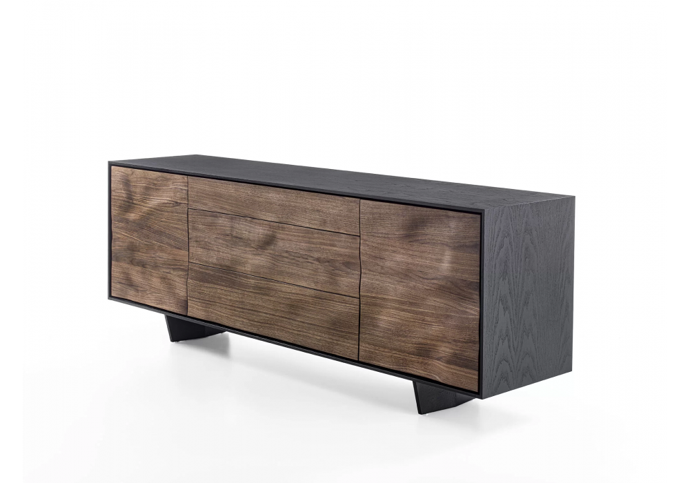 Move Low conçu par Authentic Design pour Riva 1920 est un buffet bas en bois massif et latté, entouré d'un cadre en bois. Le travail particulier des portes et des façades des tiroirs crée un effet sculptural grâce à l'extrusion du bois, lui donnant un mouvement sinueux.