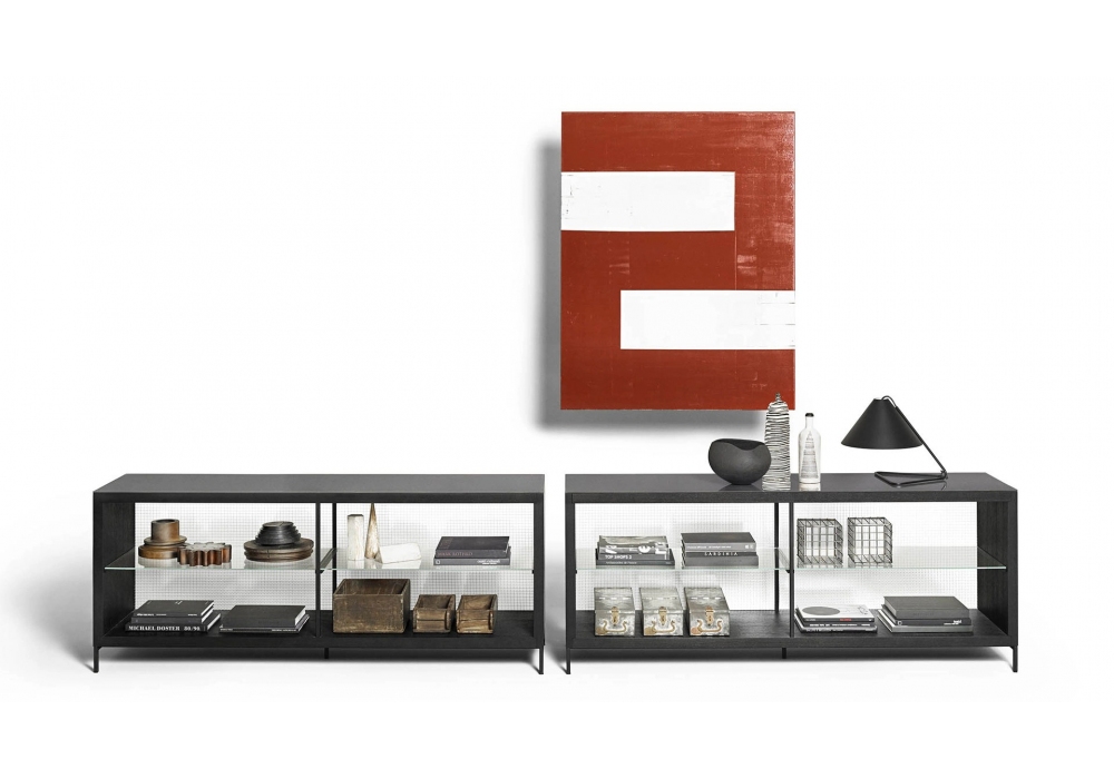 Combi Cabinet, conçu par Piero Lissoni pour DePadova, est un buffet avec base en acier peint par poudrage noir mat et pieds réglables. La structure est constituée de panneaux lattés plaqués en chêne naturel ou peint. Les étagères sont en verre transparent extra-clair tandis que le fond est en verre armé ou en verre trempé réfléchissant rétro-peint couleur café. L'étagère supérieure est en verre trempé rétro-peint couleur café. Combi Cabinet est disponible en différentes finitions et avec ou sans système d'éclairage interne.
