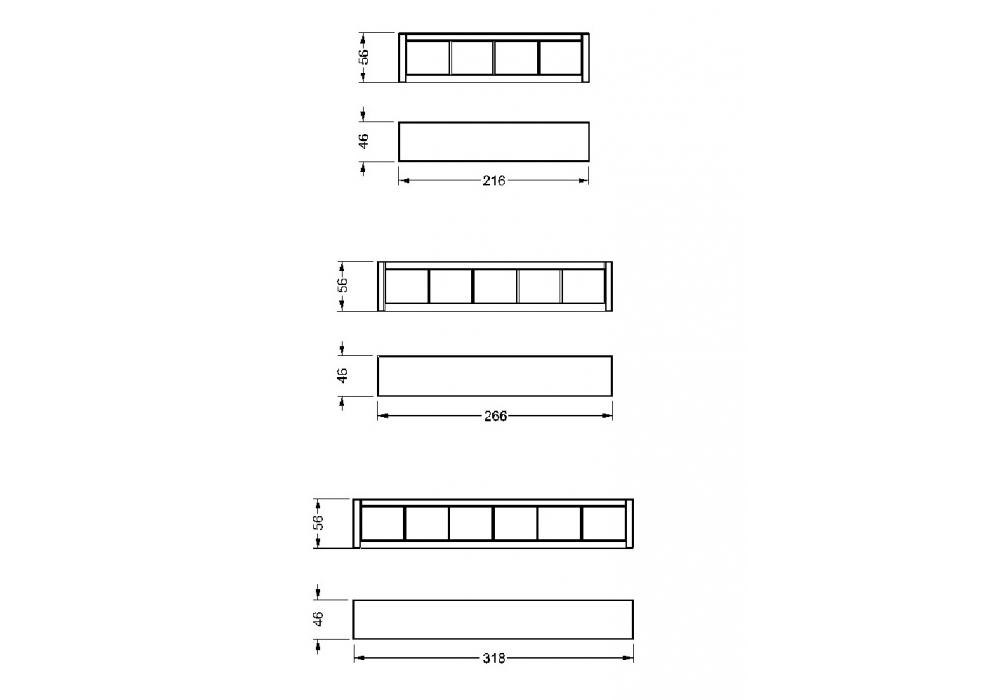 | Dimensions | 216 x 46 x H 56 cm; 266 x 46 x H 56 cm; 318 x 46 x H 56 cm. |