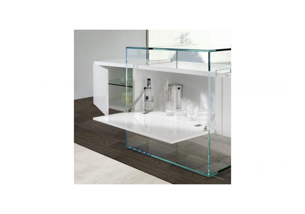 Kubo conçu par Riccardo Lucatello pour Reflex Angelo est un buffet en bois avec 4 portes battantes avec séparateur interne et 1 porte abattante, disponible en noyer canaletto, ébène brillant ou laqué brillant ou mat. Support central en verre extra-clair.