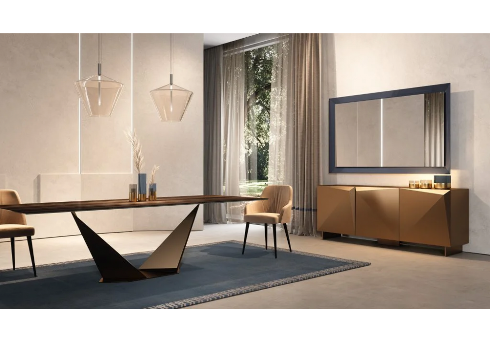 Origami Maxi conçu par Reflex Angelo est un buffet en bois avec 3 portes. Étagères intérieures en verre. Pieds en verre transparent ou en métal finition bronze.