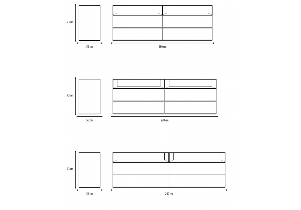 | Dimensions | 180 x 56 x H 73 cm; 220 x 56 x H 73 cm; 240 x 56 x H 73 cm. |