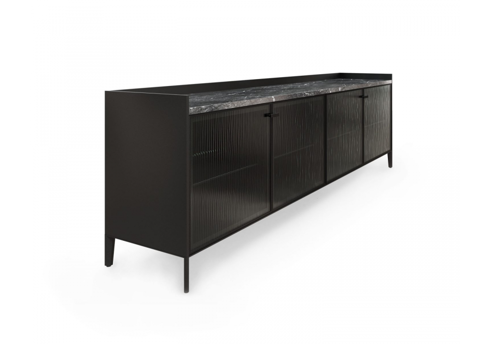 Segesta conçu par Studio Klass pour Fiam est un buffet avec structure en bois laqué décliné en différentes finitions métallisées. Le plateau est en marbre ou en bois plaqué. La base et les pieds sont en acier peint en noir. Les portes sont en verre trempé, disponibles en versions lisse, fusionnée ou gravée à l'acide. Le buffet est équipé d'étagères intérieures en verre trempé. Un système d'éclairage LED est intégré à la structure interne (en option). Un plateau de la même couleur que la structure est également disponible sur demande.