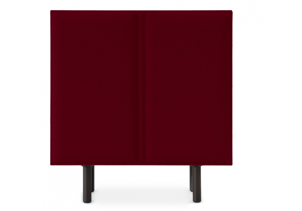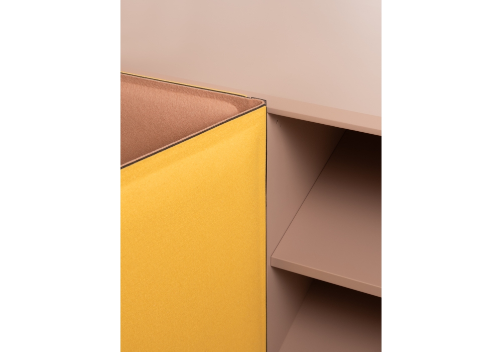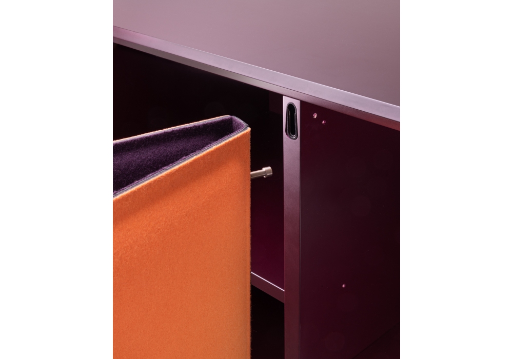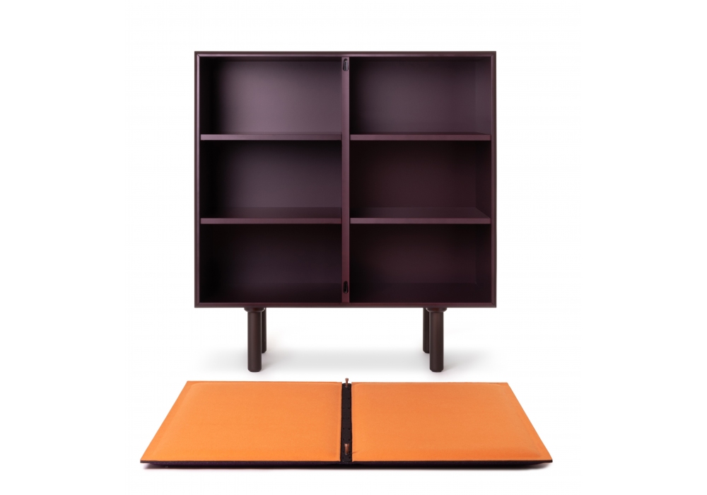 Tacito conçu par Alessandro Stabile pour Magis est un meuble de rangement haut avec une structure (côtés, dos et étagères) en MDF peint, des portes en feutre et des pieds en aluminium anodisé en finition marron foncé.