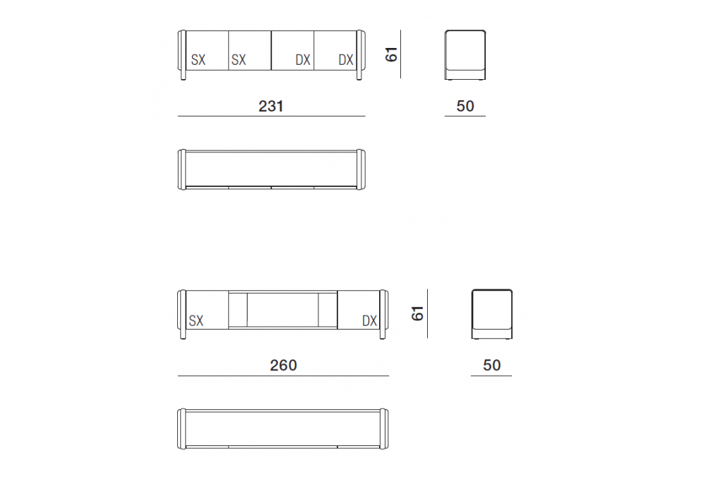 | Dimensions | 231 x 50 x H 61 cm; 260 x 50 x H 61 cm. |