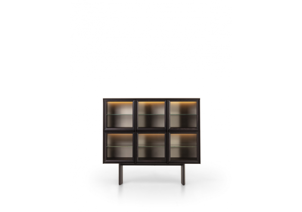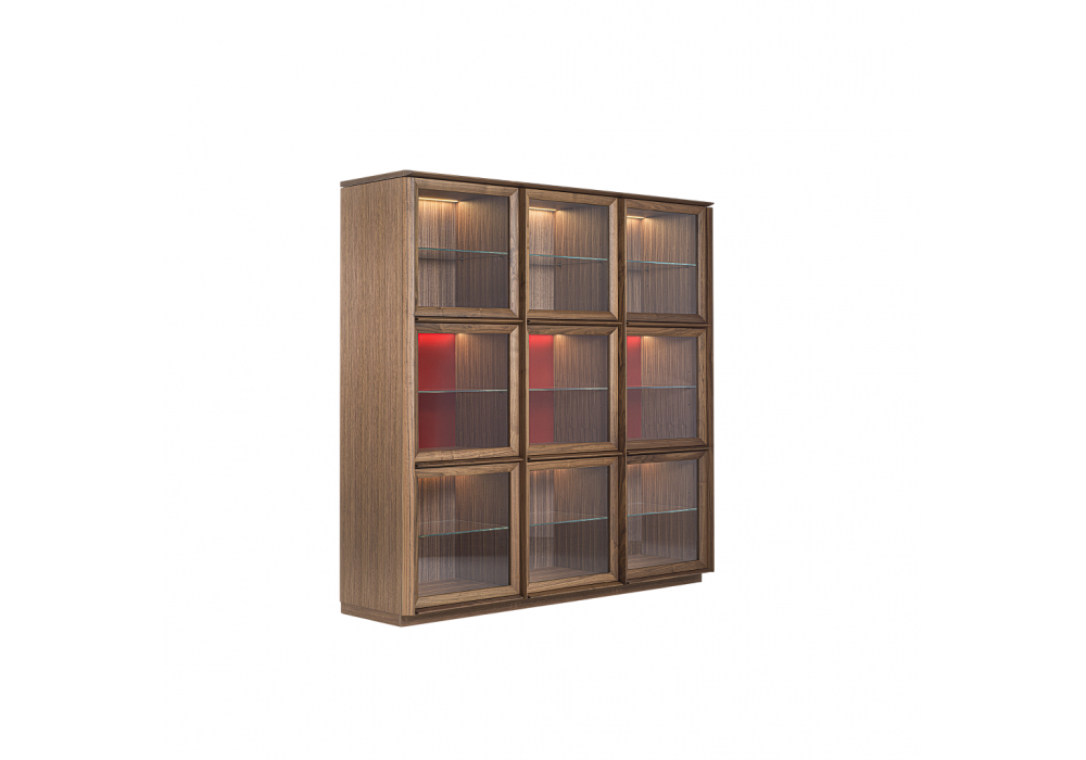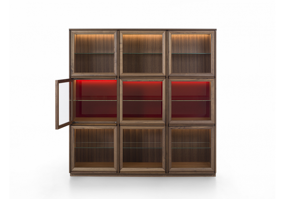 Pierre conçu par Gabriele & Oscar Buratti pour Porada est un système modulaire disponible en modules de 60 ou 120 cm de large et jusqu'à 300 cm de haut, réalisés en noyer Canaletta ou en chêne. Sa structure se distingue par le profilé en bois massif intégré aux éléments verticaux et horizontaux, avec des portes en verre ou en bois. Les intérieurs sont personnalisables avec un éclairage LED, des panneaux arrière laqués assortis ou brillants, des étagères en verre ou en bois, et des plateaux en bois ou en marbre avec une finition protectrice brillante. Le système peut être complété par des panneaux TV jusqu'à 85 pouces, des étagères murales et des éléments bas en bois, offrant ainsi des solutions élégantes et polyvalentes pour l'espace de vie.