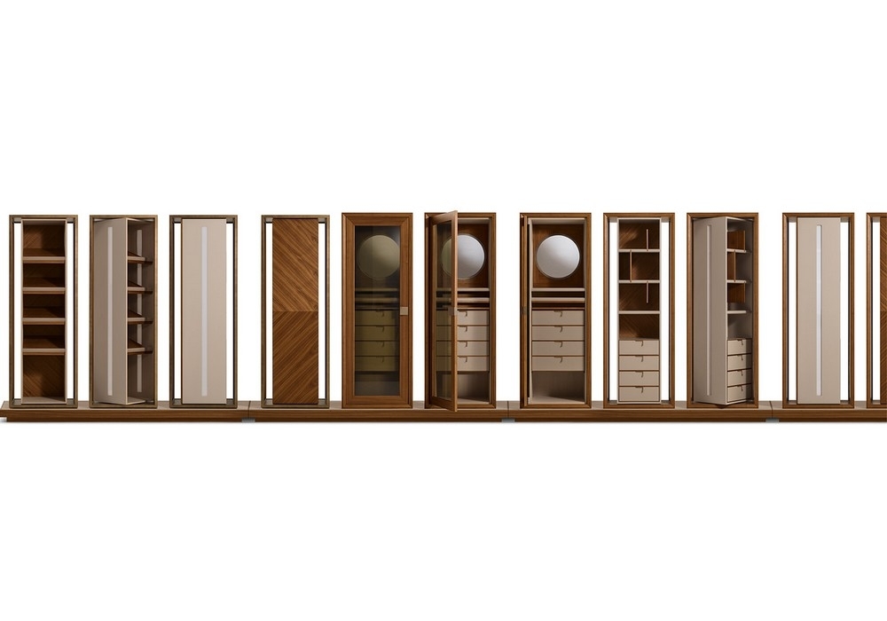 Town is a cabinet designed by Carlo Colombo for Giorgetti. Town represents a new skyline for living: it is a multifunctional piece of furniture that came into being with the objective of composing as preferred, depending on spaces and requirements, the rooms of the home. Town combines functionality and aesthetics, offering space to contain, from books to tableware, to furnish with solutions suitable for every need. Multifunctional piece of furniture with a single, double or triple base with veneer and solid walnut canaletto wood and LED lighting on the lower part of the base. This one can have the insert in Afyon marble with retro- illumination with a LED lamp or in mdf with glazed mat lacquer available in 5 colours (dove-grey, tobacco, hazel, coloniale and milky). The cabinet frame can be swivel or with a rollaway door. The external structure of the swivel version can have veneer and solid walnut canaletto wood and lateral LED lighting, or a metal frame painted in a bronze colour with natural effect and transparent crystal glass joined with a wire fabric. The internal structure in mdf is glazed mat lacquered in 5 colours with the back in walnut canaletto wood (fin.11) veneer. The shelves and the partitions are in walnut canaletto wood, while the edges and the front sides of the drawers, with metal handle and with silent system total extraction receding guides, are covered with saddle leather. The inclined shelves have metal inserts to place shoes, while the bar version has a removable shelf and shelves for glasses with an anti-slip mat lacquer in 5 colours. The external structure of the version with a rollaway door has veneer and solid walnut canaletto wood and LED lighting on the side. The internal frame in mdf is glazed mat lacquered in 5 colours and it has a rollaway door with right or left opening. The door is available in walnut canaletto wood or in bronze tempered crystal glass with the edge in walnut canaletto wood. Both of them have the metal handle painted in a bronze colour with natural effect. Each element can have different functions: open element, with shelves and partitions in walnut canaletto wood or with bronze tempered crystal glass shelf, with flap door and cigar humidor holder, with flap door and fridge, or with round mirror and drawers with one removable shelf and one with tie rack.