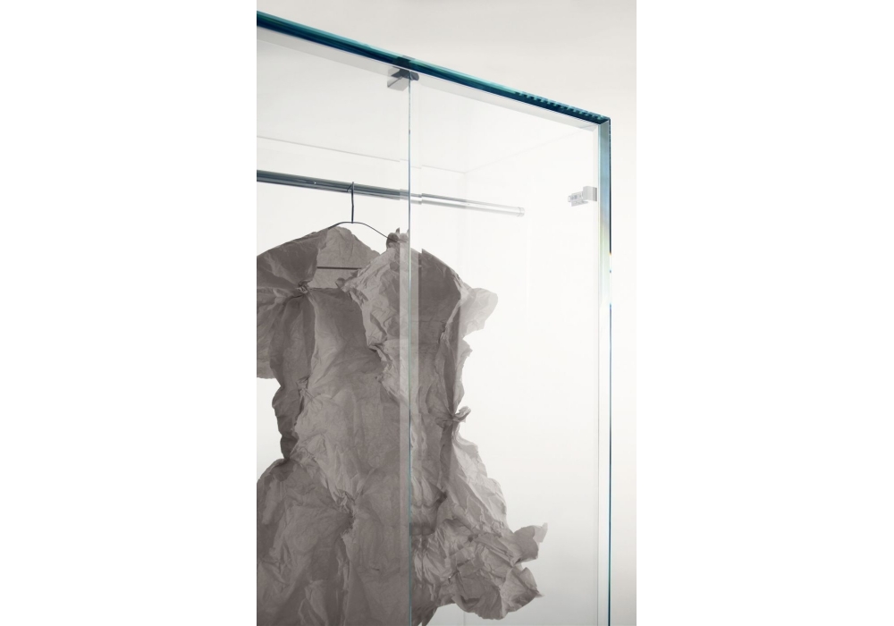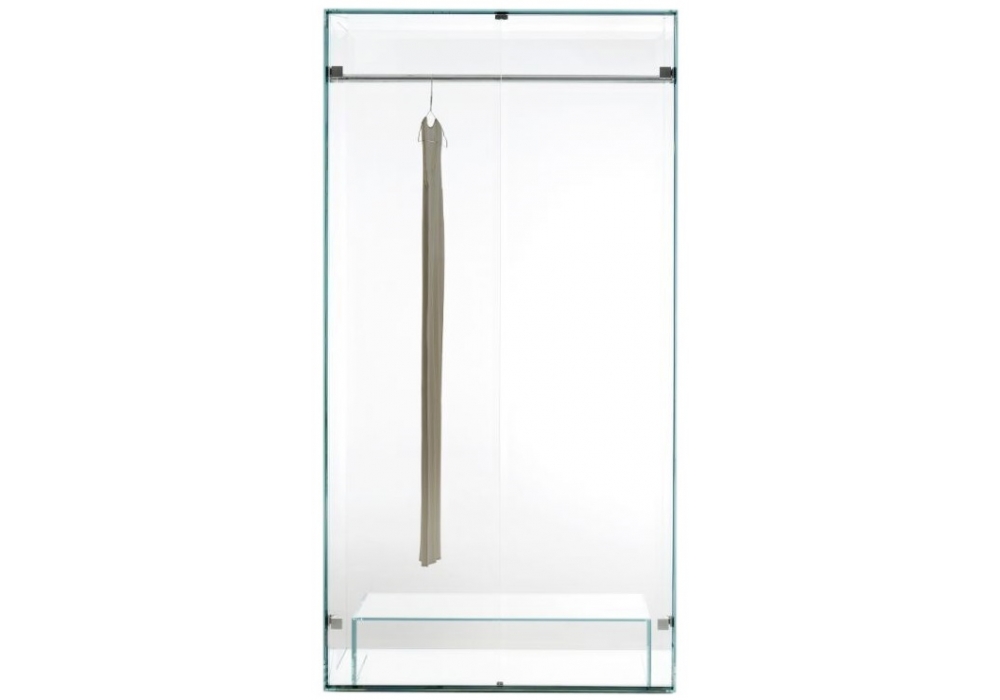 Prism Glass conçue par Tokujin Yoshioka pour Glas Italia est une belle armoire en cristal transparent extra-light de 12mm, trempé et thermosoudé, avec des biseautages spéciaux et précieux qui reflètent et réfractent la lumière. La base est en miroir extra-light alors que la penderie et la quincaillerie sont en acier poli. Sur la base est positionné un petit banc dans le même matériel et avec la même finition que l’armoire. Les portes, en cristal extra-light de 8mm trempé, s’ouvrent avec un confortable système pushpull. C’est un expositoire qui magnifie et met en valeur les vêtements ou les objets qu’elle contient.
