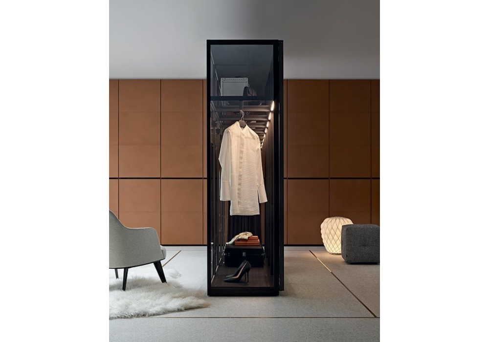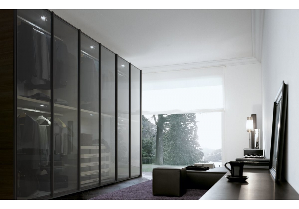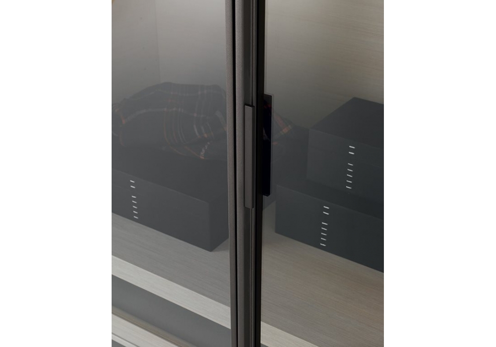 Ego conçu par Giuseppe Bavuso pour Poliform est une armoire avec portes en verre et cadre en aluminium. Ego est une garde-robe légère et transparente.