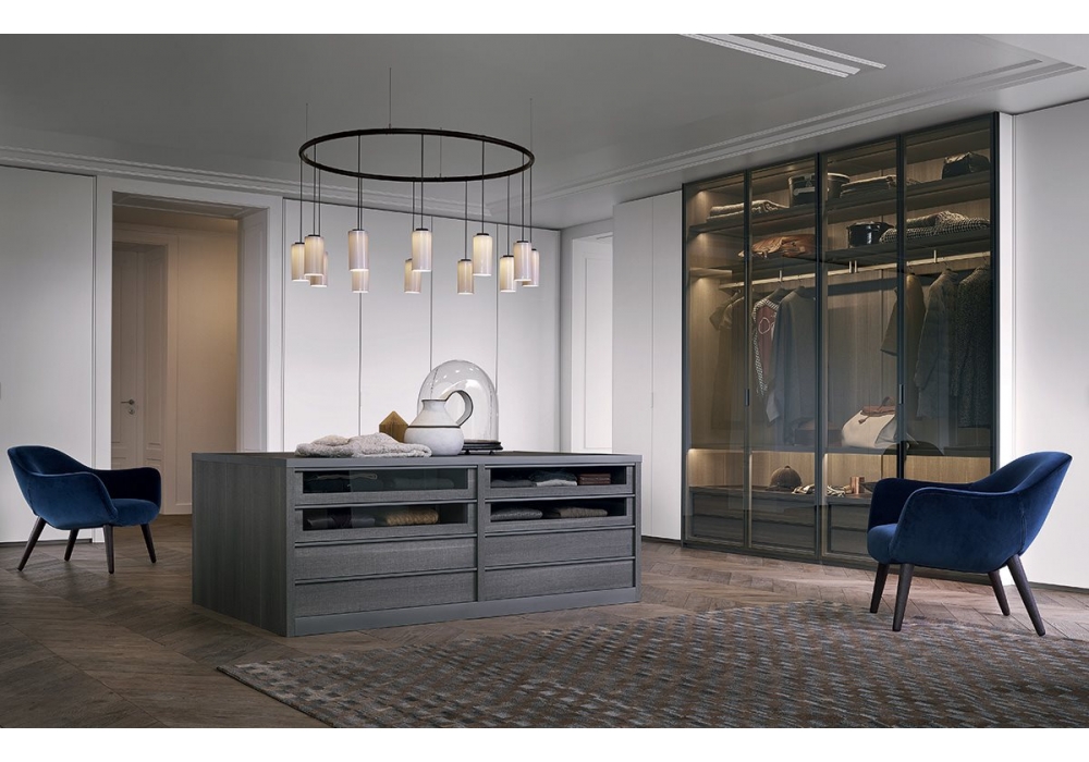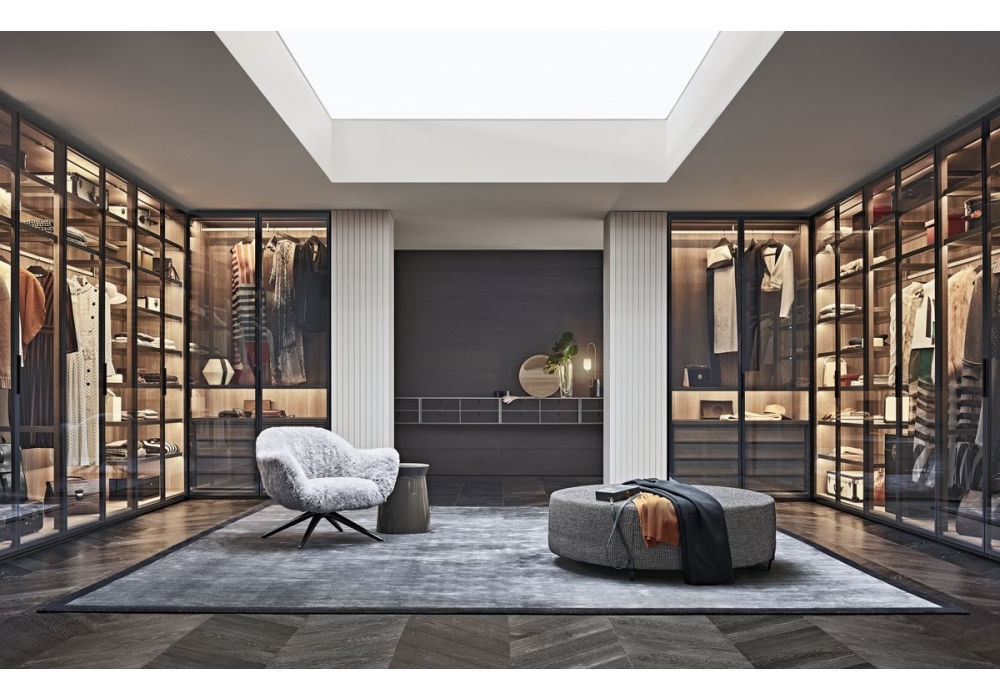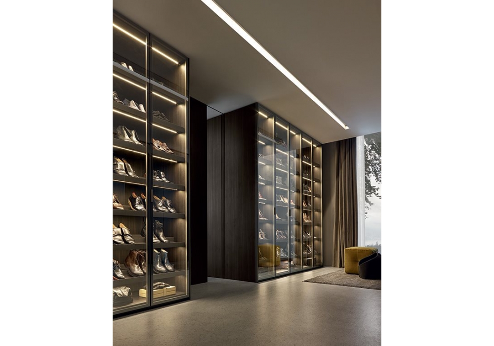 Fitted conçu par Rodolfo Dordoni pour Poliform est une armoire avec portes en verre ou laqué mat et cadre en aluminium.