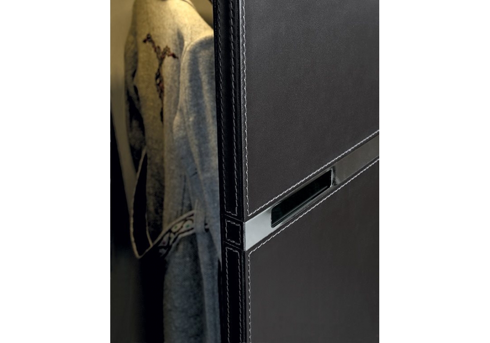 Bangkok conçu par Operadesign pour Poliform est une armoire avec portes recouvertes de cuir de selle de couleur et de profilés métalliques. La poignée est intégrée au profil horizontal.