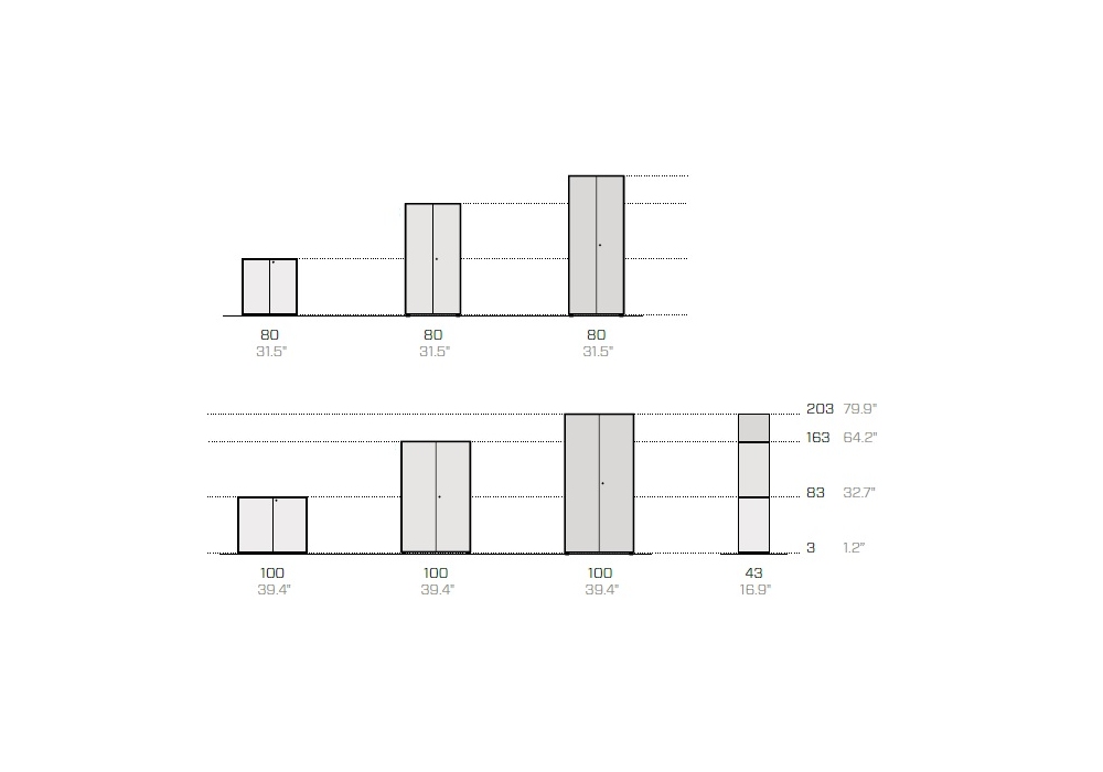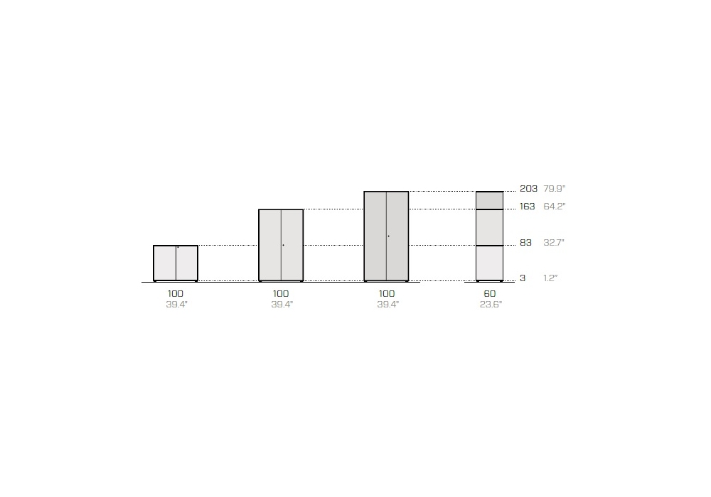 | Dimensions | • 80 x 43 x H 83 cm; • 80 x 43 x H 163 cm; • 80 x 43 x H 203 cm; • 100 x 43 x H 83 cm; • 100 x 43 x H 163 cm; • 100 x 43 x H 203 cm; • 100 x 60 x H 83 cm; • 100 x 60 x H 163 cm; • 100 x 60 x H 203 cm |