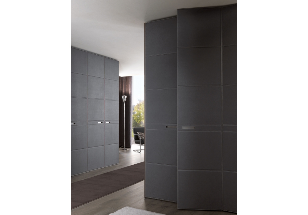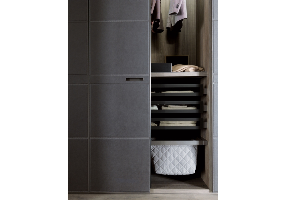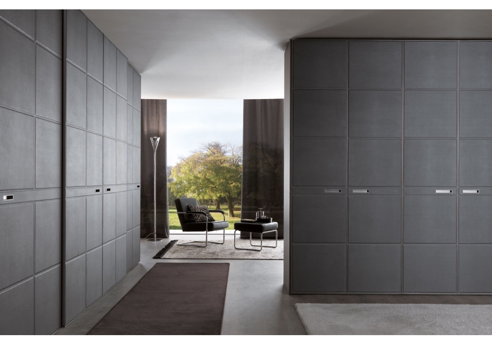 London conçue par MisuraEmme est une garde-robe qui crée un environnement dynamique et raffiné, très actuel mais traditionnel. Le jeu des carrés en relief et délimité par une couture avec la poignée insérée dans le rectangle qui divise les carrés et crée un jeu harmonieux. Les portes sont recouvertes de cuir ou de cuir écologique.
