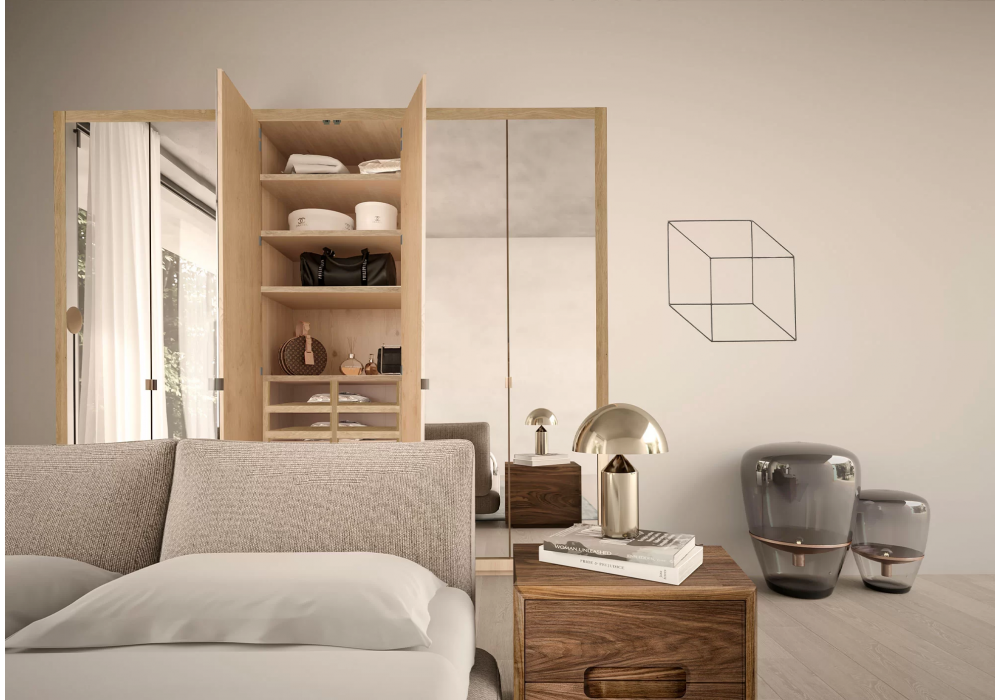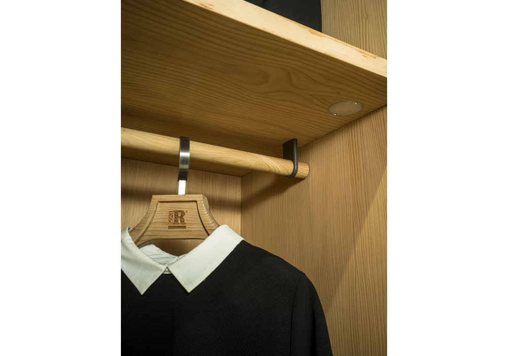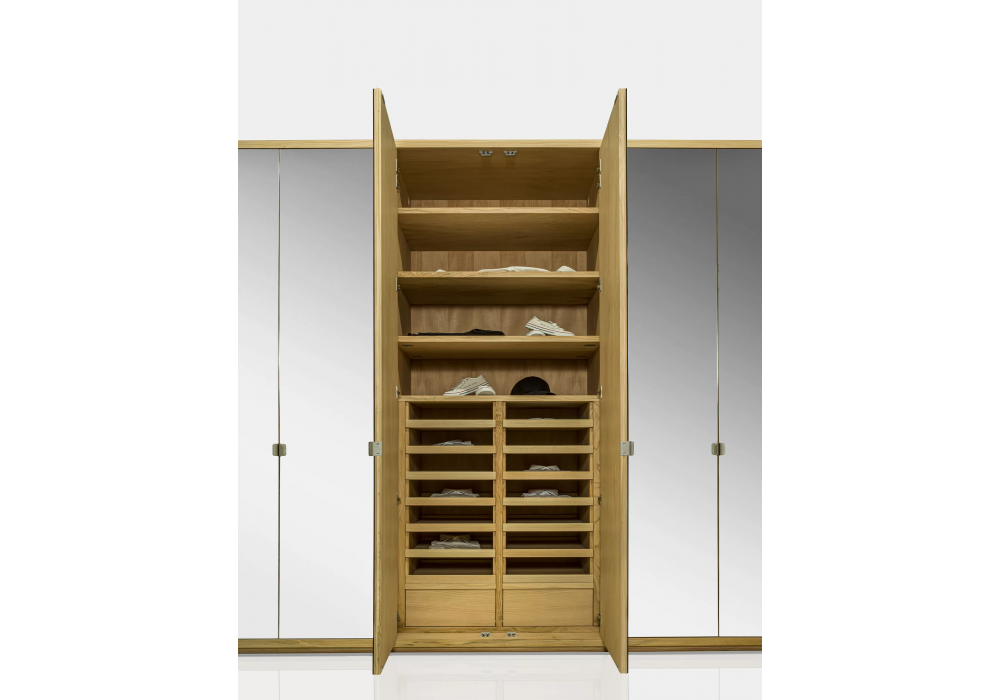 Cornice conçue par Authentic Design pour Riva 1920 est une armoire en bois massif et latté, caractérisée par des portes battantes en miroir et un cadre en bois massif, avec des intérieurs en bois de cèdre parfumé, un remède naturel contre les mites. Personnalisable grâce à l'intégration de cintres, d'étagères, de commodes en bois massif à joints traditionnels en queue d'aronde et de divers accessoires, il offre une organisation fonctionnelle et modulaire des différents éléments en fonction des besoins de rangement et des dimensions souhaitées.