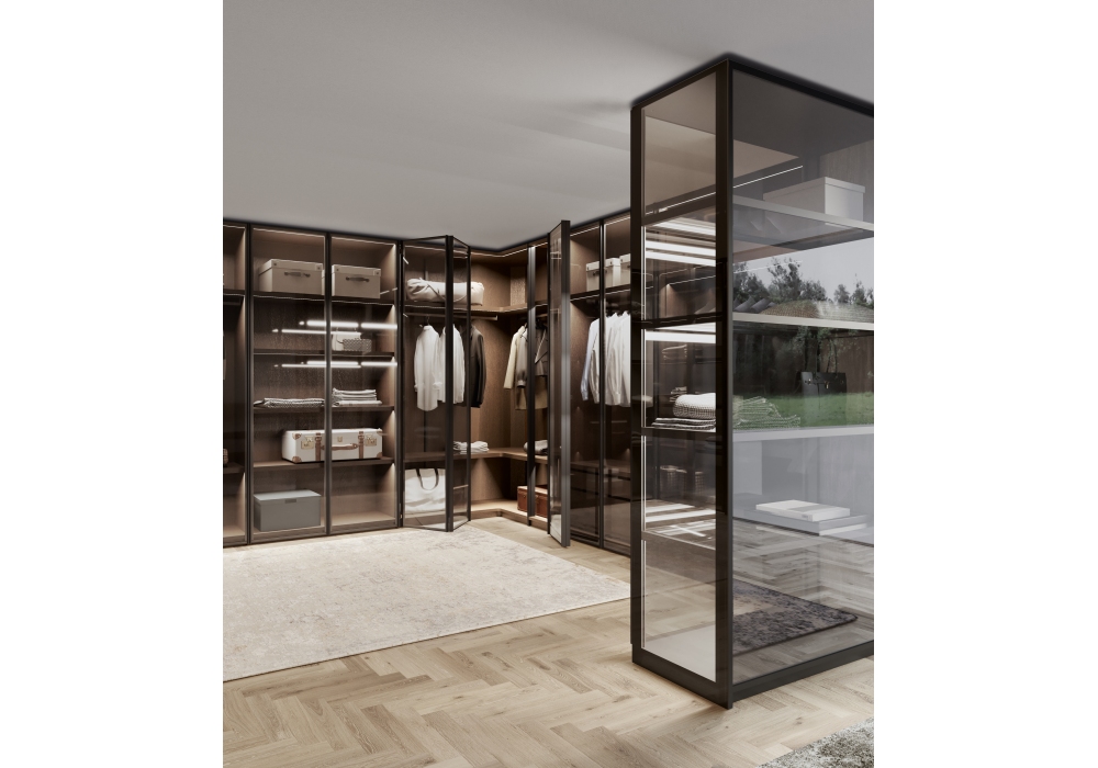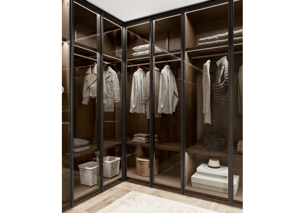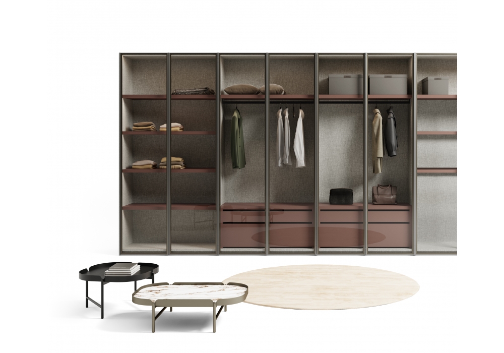 Glass Up conçue par Dall'Agnese est une armoire à portes coulissantes réalisée avec un cadre en aluminium peint et un verre trempé transparent gris, bronze transparent, tissu ou miroir. Les verres effet tissu sont obtenus en appliquant un film adhésif capable de recréer un effet similaire au tissu. Ouverture par poignée métallique intégrée dans le cadre.