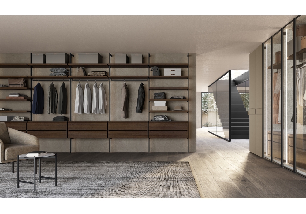 Bamboo conçue par Dall'Agnese est une cabine armoire avec étagères en aluminium, finition noire ou laiton anodisé, qui peut être installé au mur ou au centre de la pièce. Étagères et porte-chaussures en panneaux, disponibles en mélaminé ou laqué mat, avec supports en aluminium. Meubles à tiroirs muraux avec ouverture par poignée supérieure. Éclairage LED optionnel (3000 K) intégré dans le rack, activé par interrupteur ou télécommande.