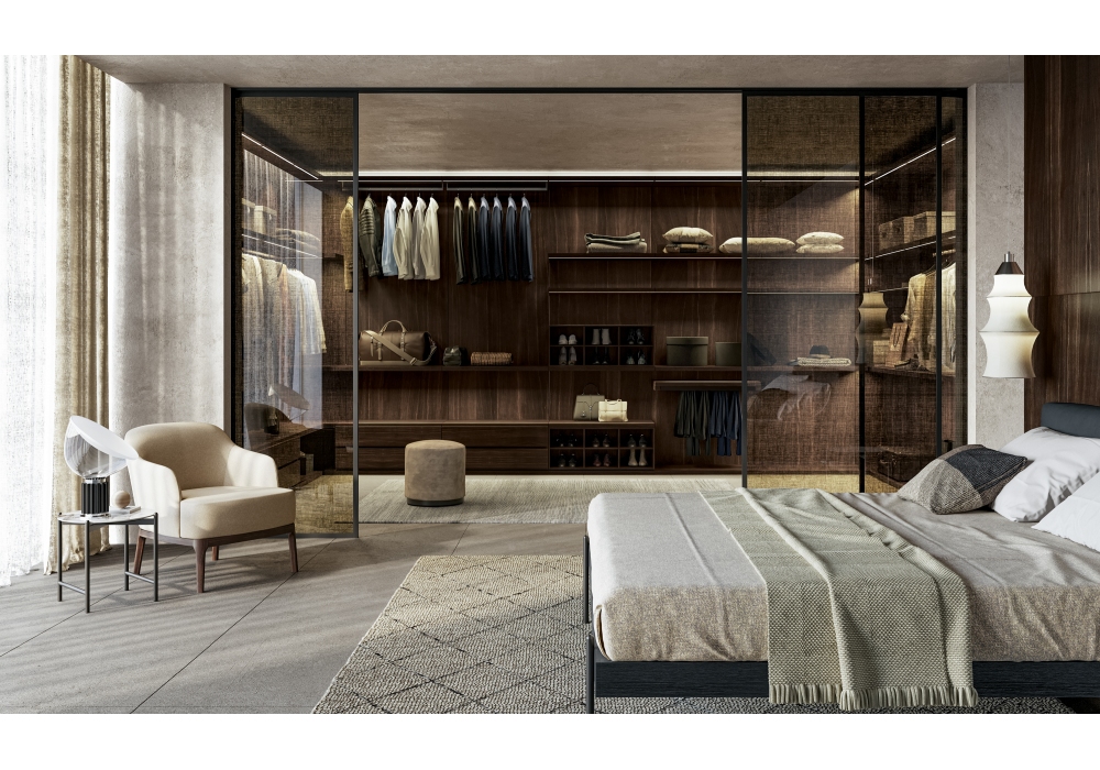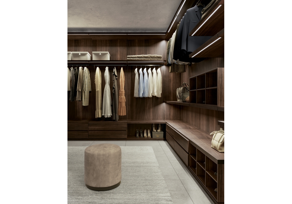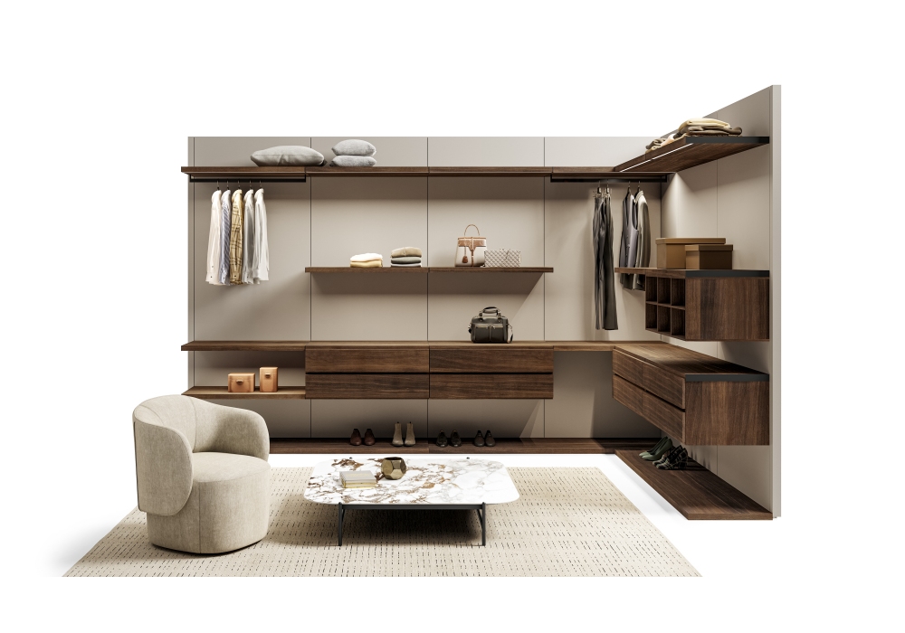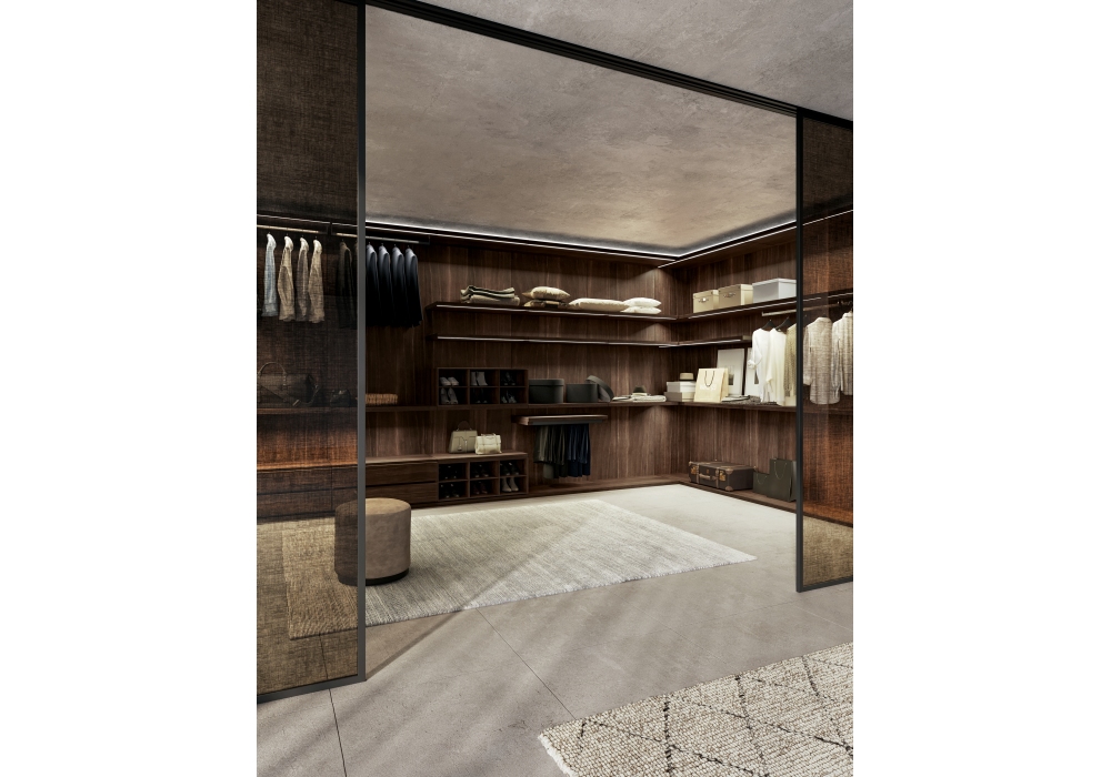 Project conçue par Dall'Agnese est une cabine armoire réalisée de supports en aluminium à réglages multiples, de supports métalliques, de panneaux de boiserie certifiés, de bancs et de fonds de tiroirs réglables, d'étagères et de couvercles en bois, de blocs-tiroirs sans poignée à fermeture amortie et d'une large gamme d'accessoires fonctionnels, notamment des porte-pantalons, des porte-chaussures, des tringles à vêtements et des luminaires. Un design élégant et des matériaux de haute qualité pour une organisation polyvalente et personnalisable.