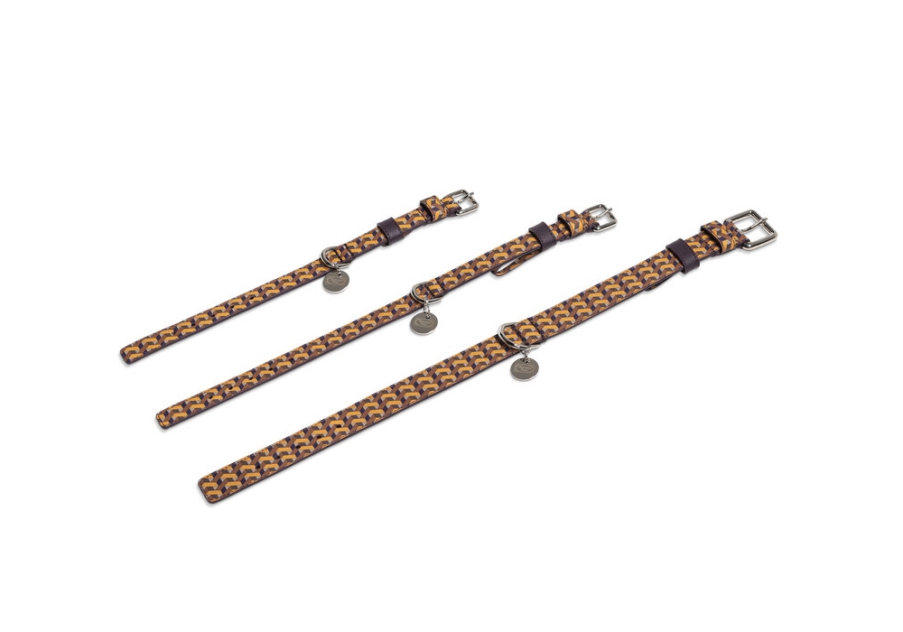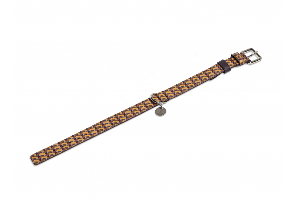 Le collier conçu par Poltrona Frau Style & Design Center est un collier composé de Pelle Frau® à l'extérieur et de Pelle Frau® Motif Weavers à l'intérieur. Il est équipé d'un renfort interne anti-déchirure, de boucles en forme de D, d'anneaux en laiton nickelé et d'une plaque en Zamak galvanisé nickel poli.