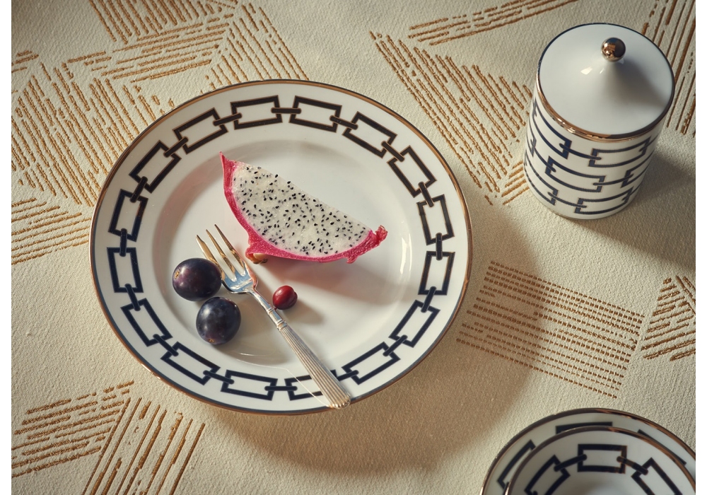 Piatto Dessert Catene Nero conçue par Ginori 1735 est une assiette plate décorée pour le dessert.