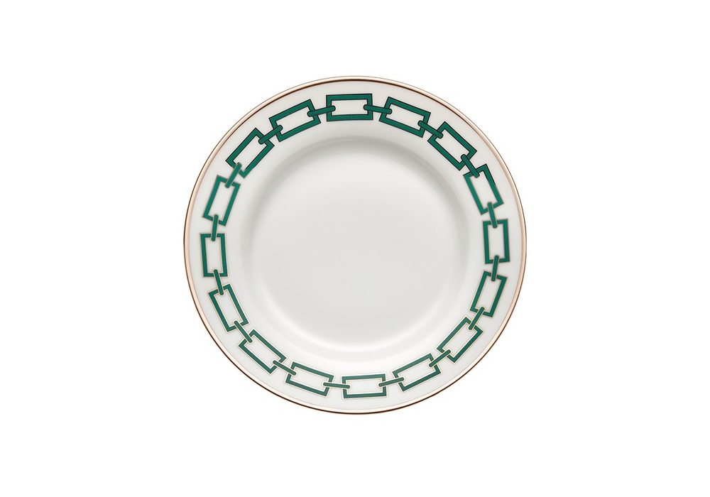 Piatto Dessert Catene Smeraldo conçue par Ginori 1735 est une assiette plate décorée pour le dessert.