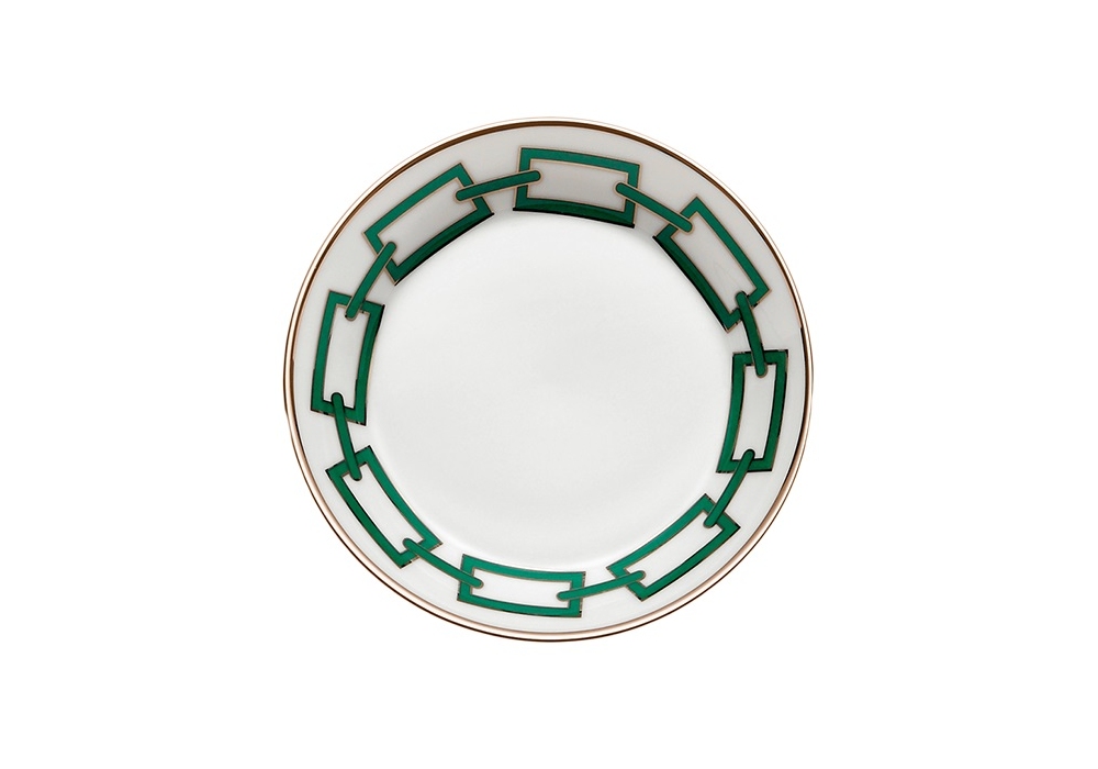 Piatto Tè Catene Smeraldo conçue par Ginori 1735 est une soucoupe décorée pour tasse de thé.