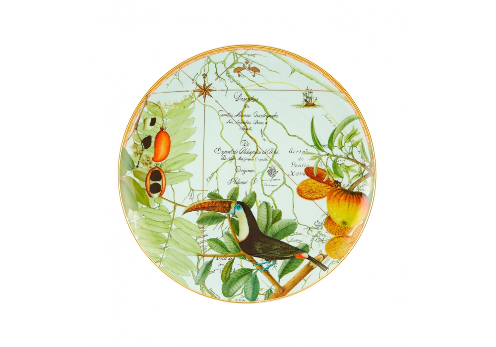Amazonia conçue par Vista Alegre avec Ecoarts est une assiette XL en porcelaine avec des décorations inspirées de la flore et de la faune.