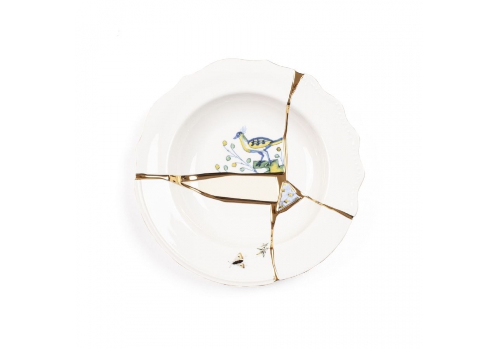 Kintsugi conçue par Marcantonio pour Seletti est une assiette en porcelaine blanche décorée de divers pigments. Kntsugi est disponible en différents modèles.