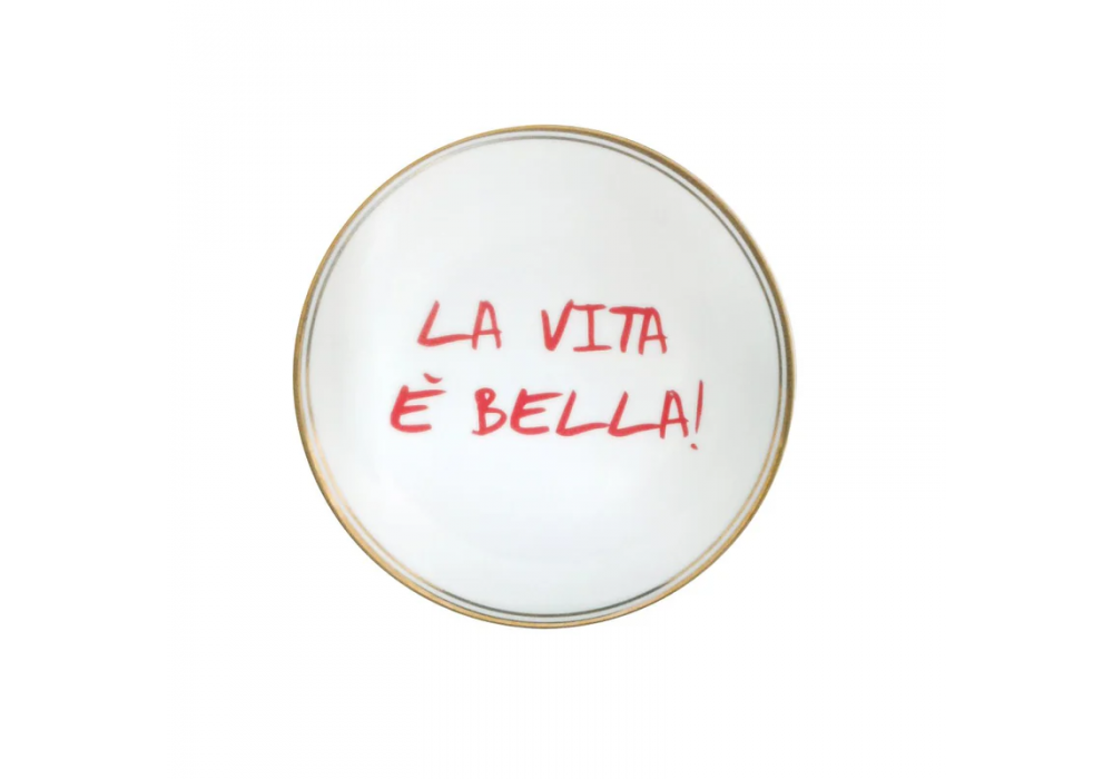 La Vita è Bella conçue par Bitossi Home est une assiette en porcelaine avec un décalque de bord doré. Convient aux lave-vaisselle Max 250 lavages. Ne convient pas au micro-ondes.